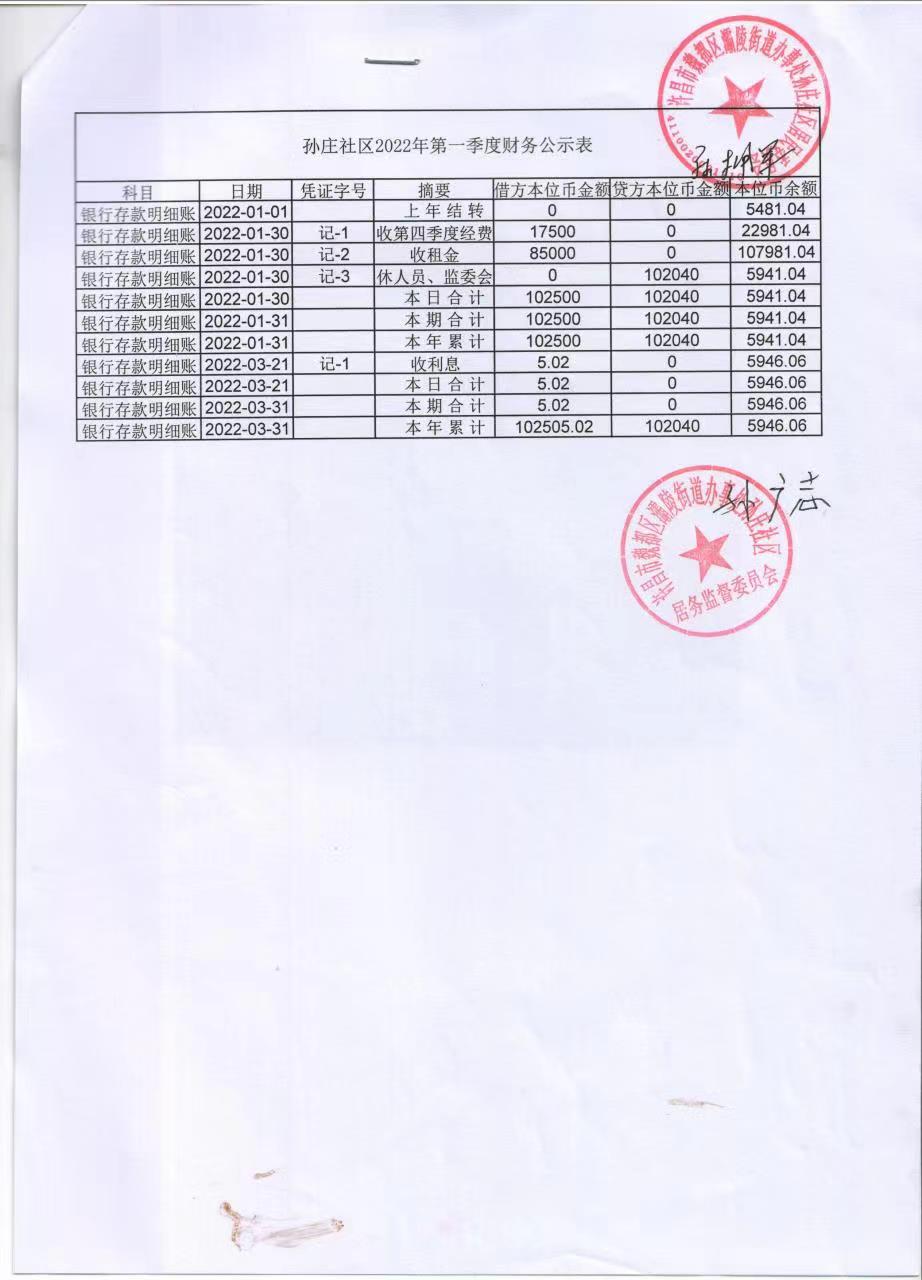 灞陵办事处孙庄社区2022年第一季度银行存款公示表