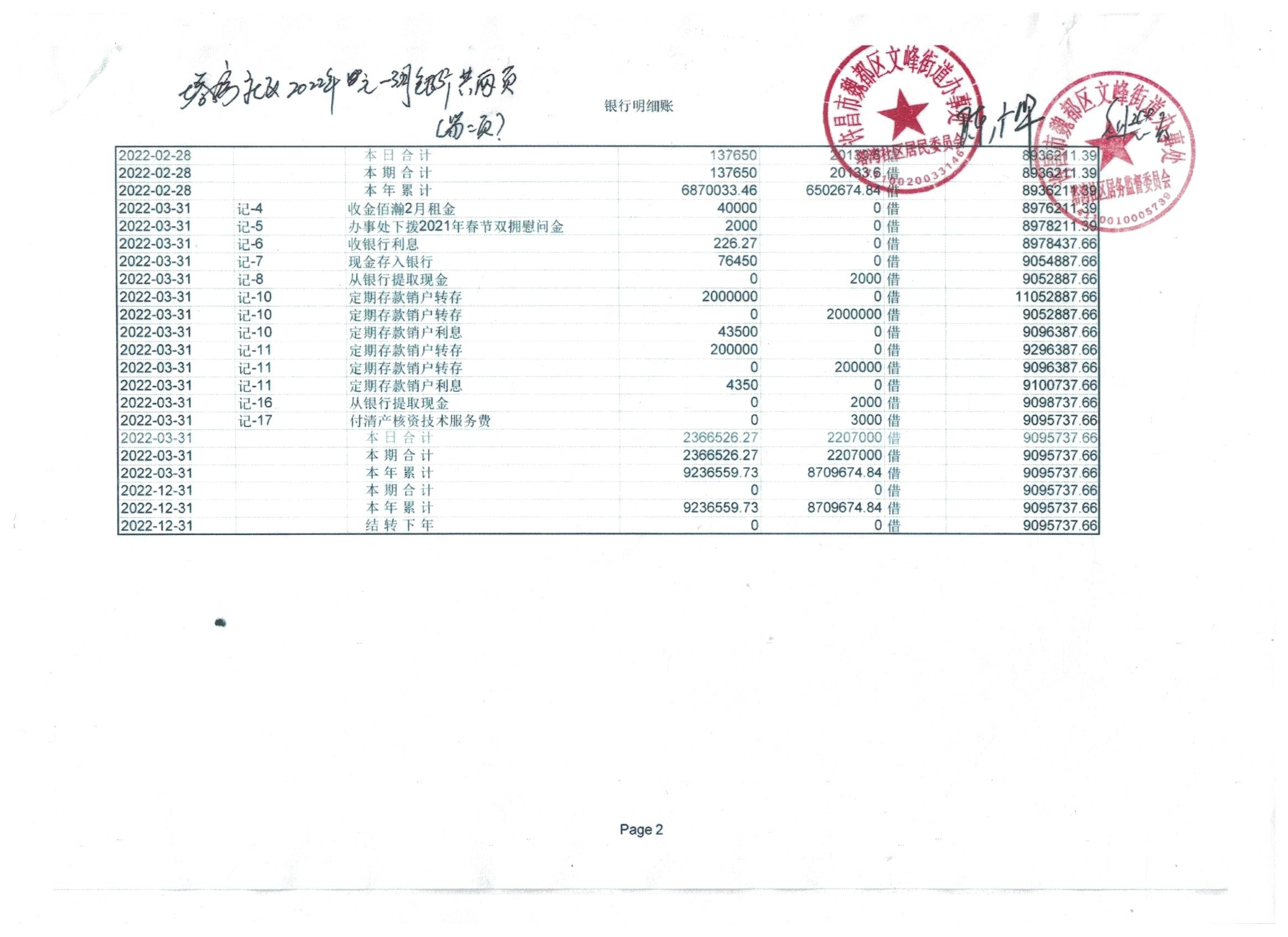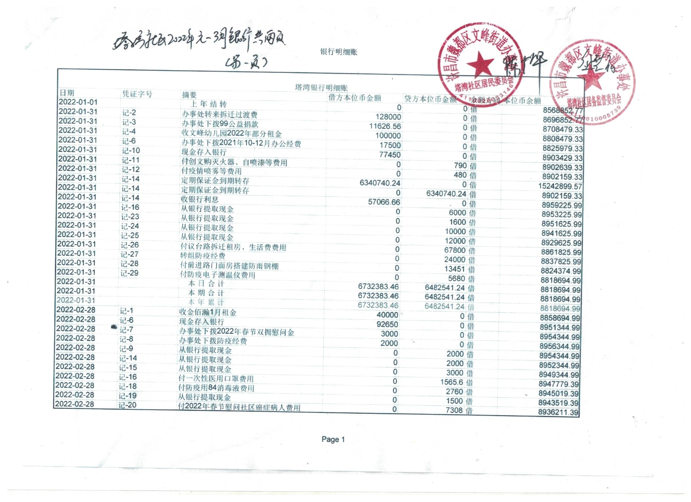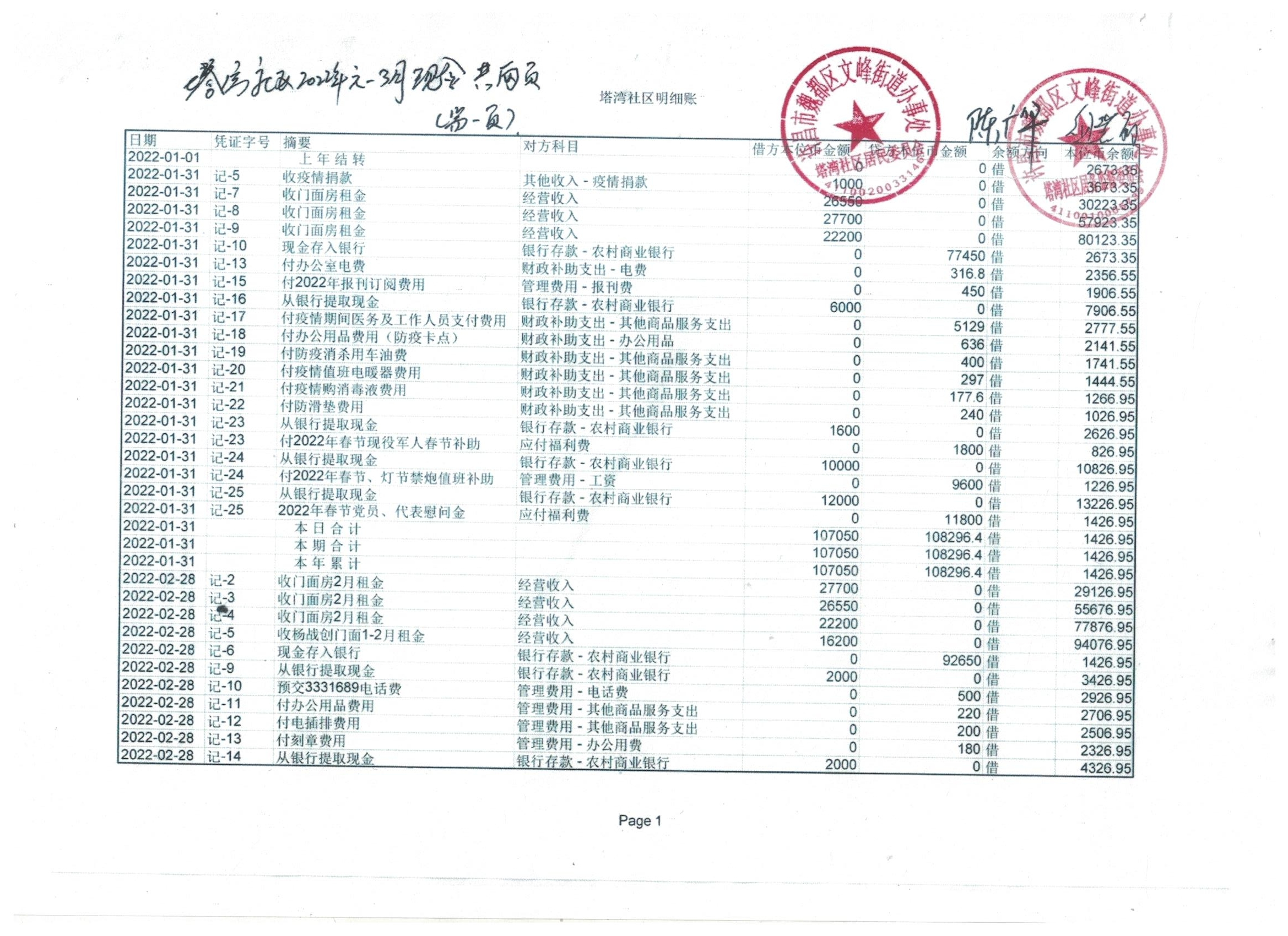 文峰街道办事处塔湾社区2022年第一季度现金、银行存款账户公开表