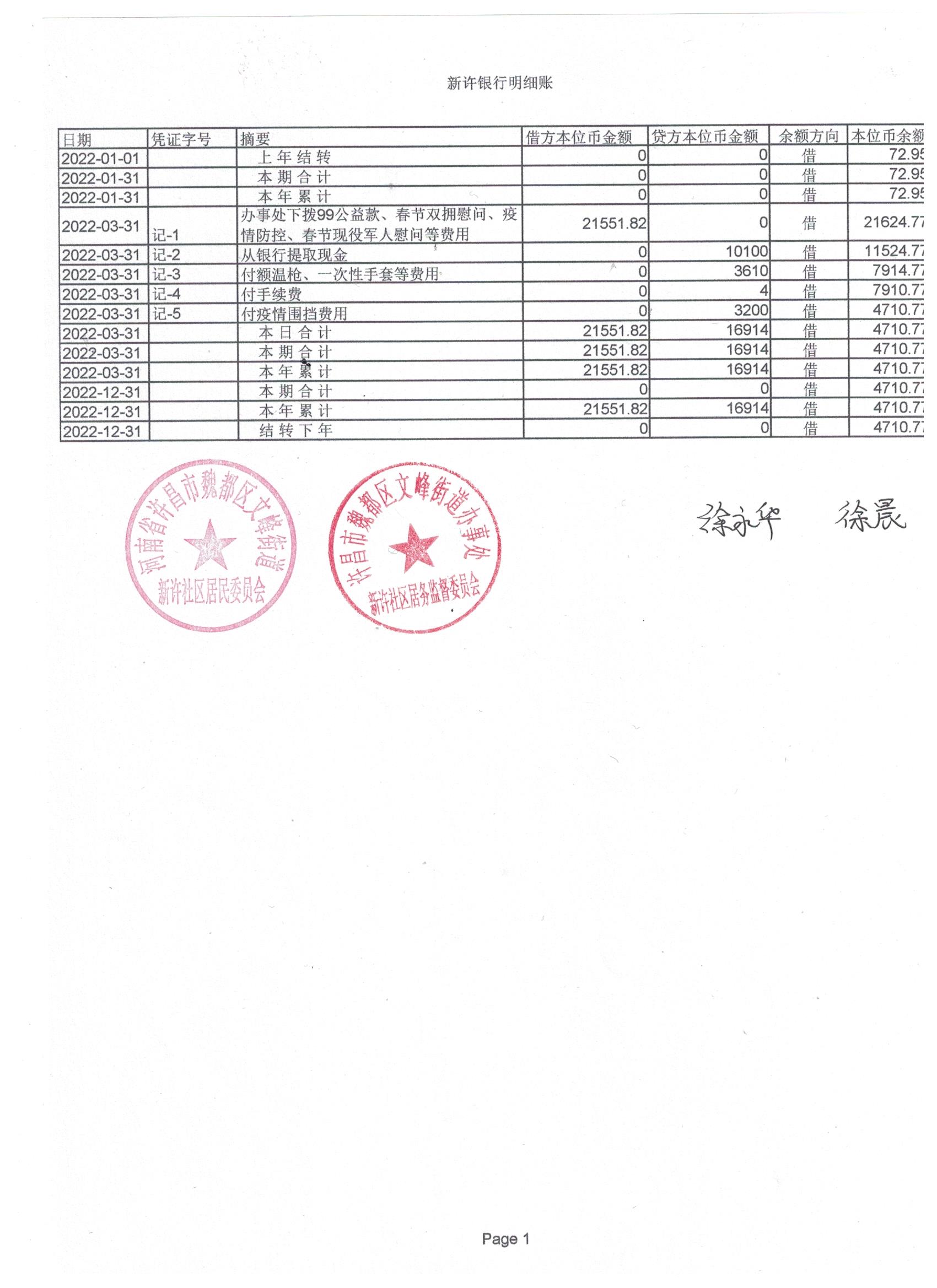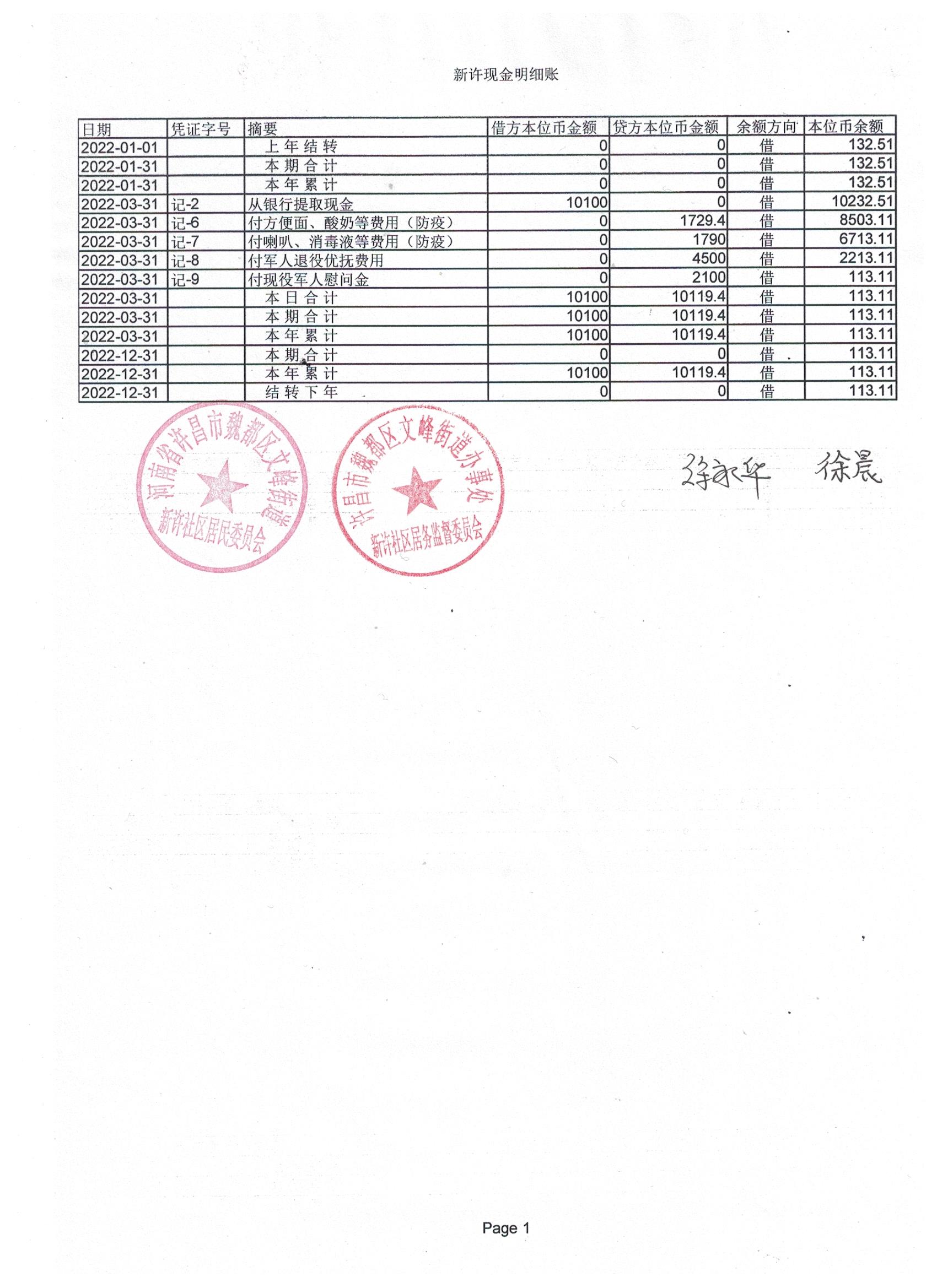 文峰办事处新许社区2022年第一季度现金、银行存款账户公开表