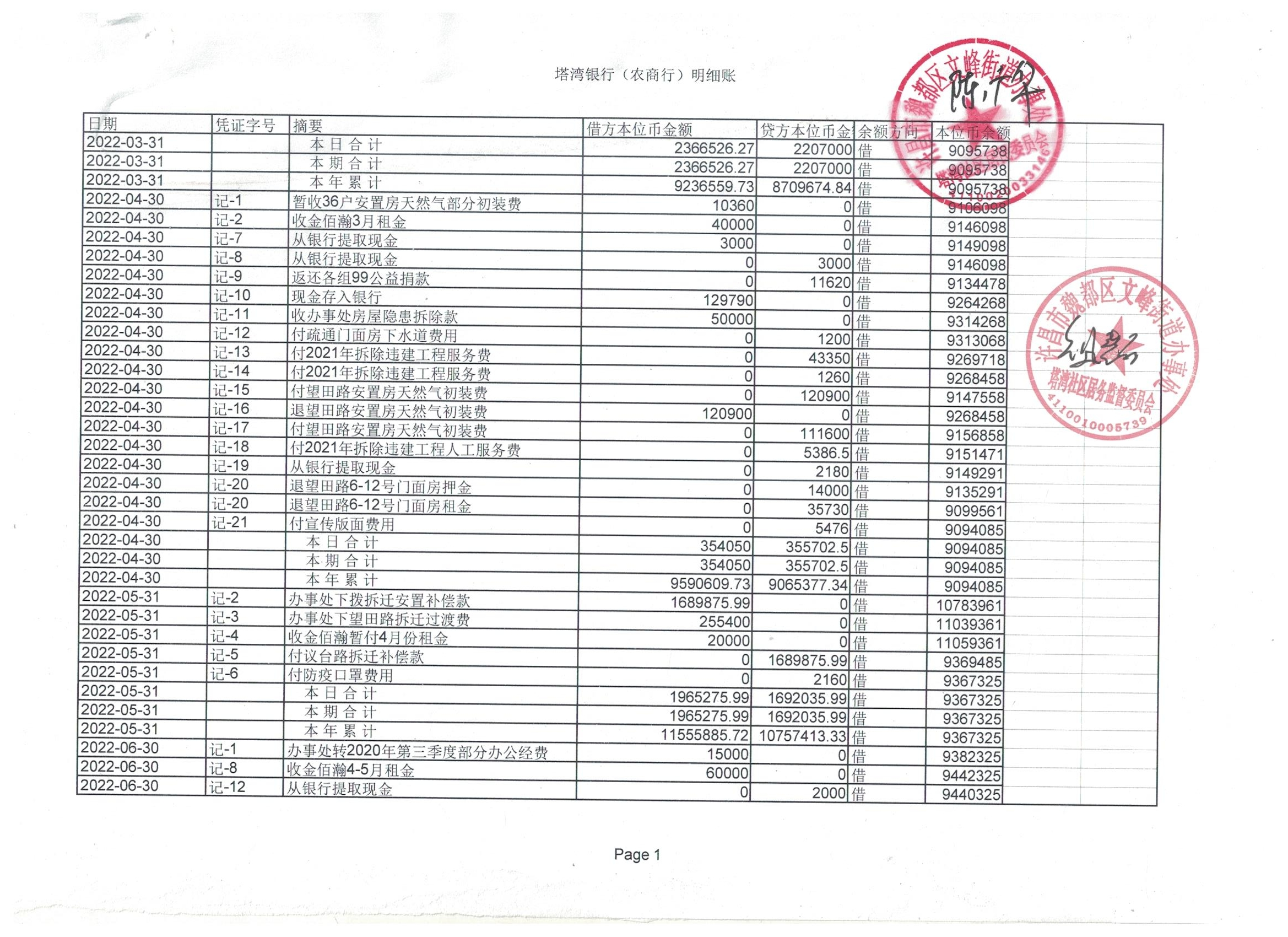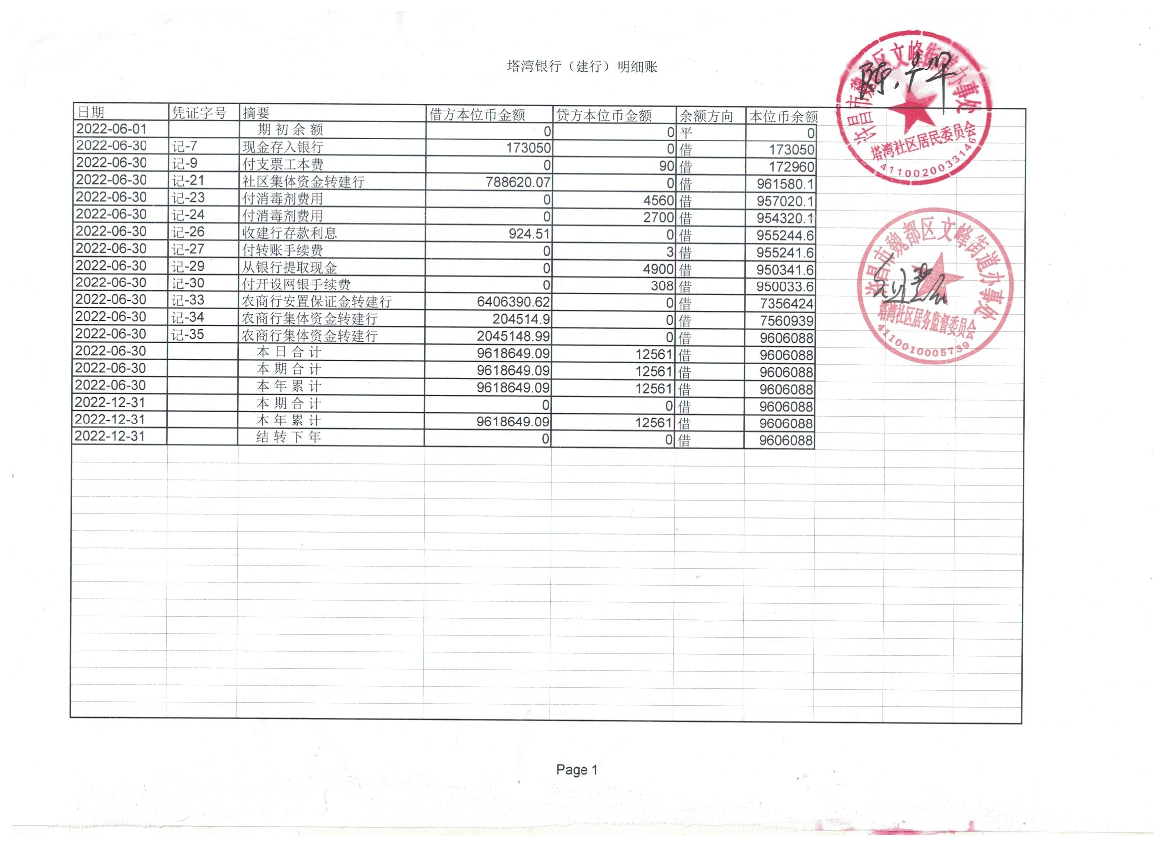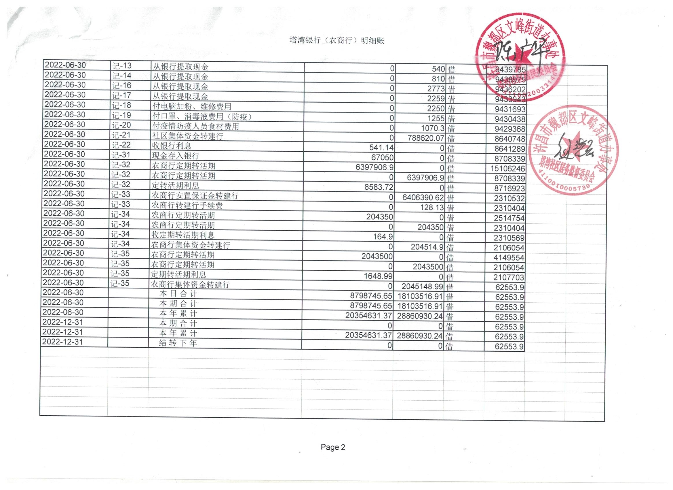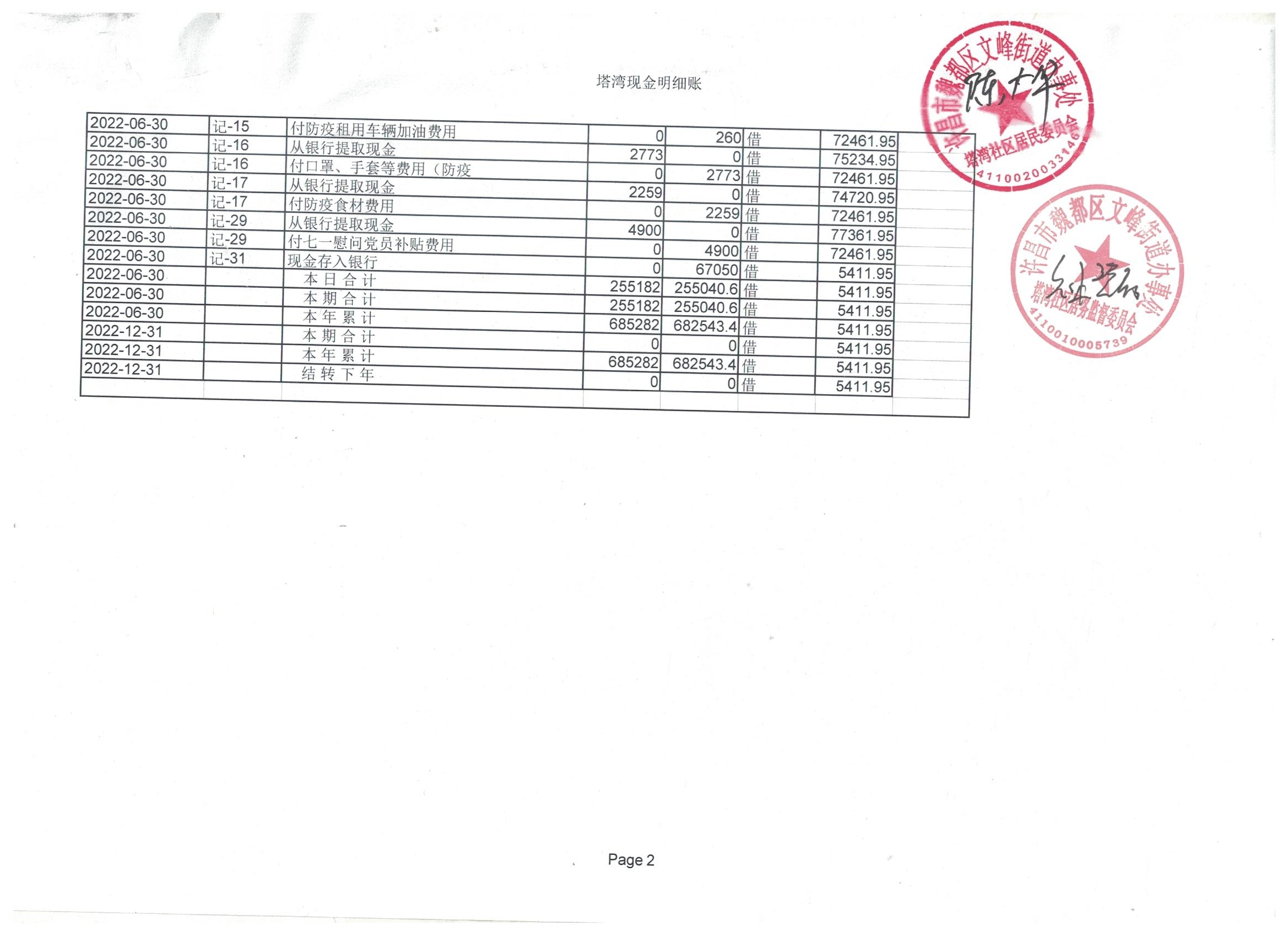 文峰街道办事处塔湾社区2022年第二季度现金、银行存款账户公开表