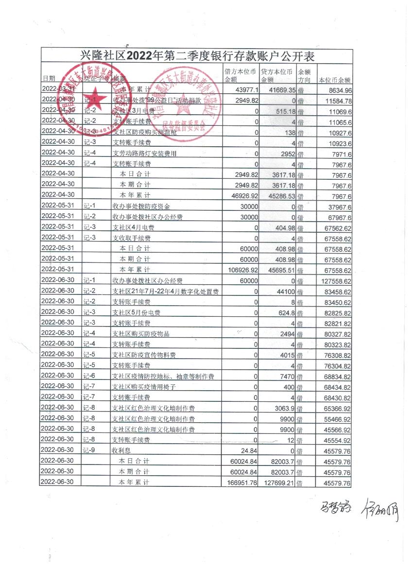 东大街道办事处兴隆社区2022年第二季度银行存款账户财务公开表