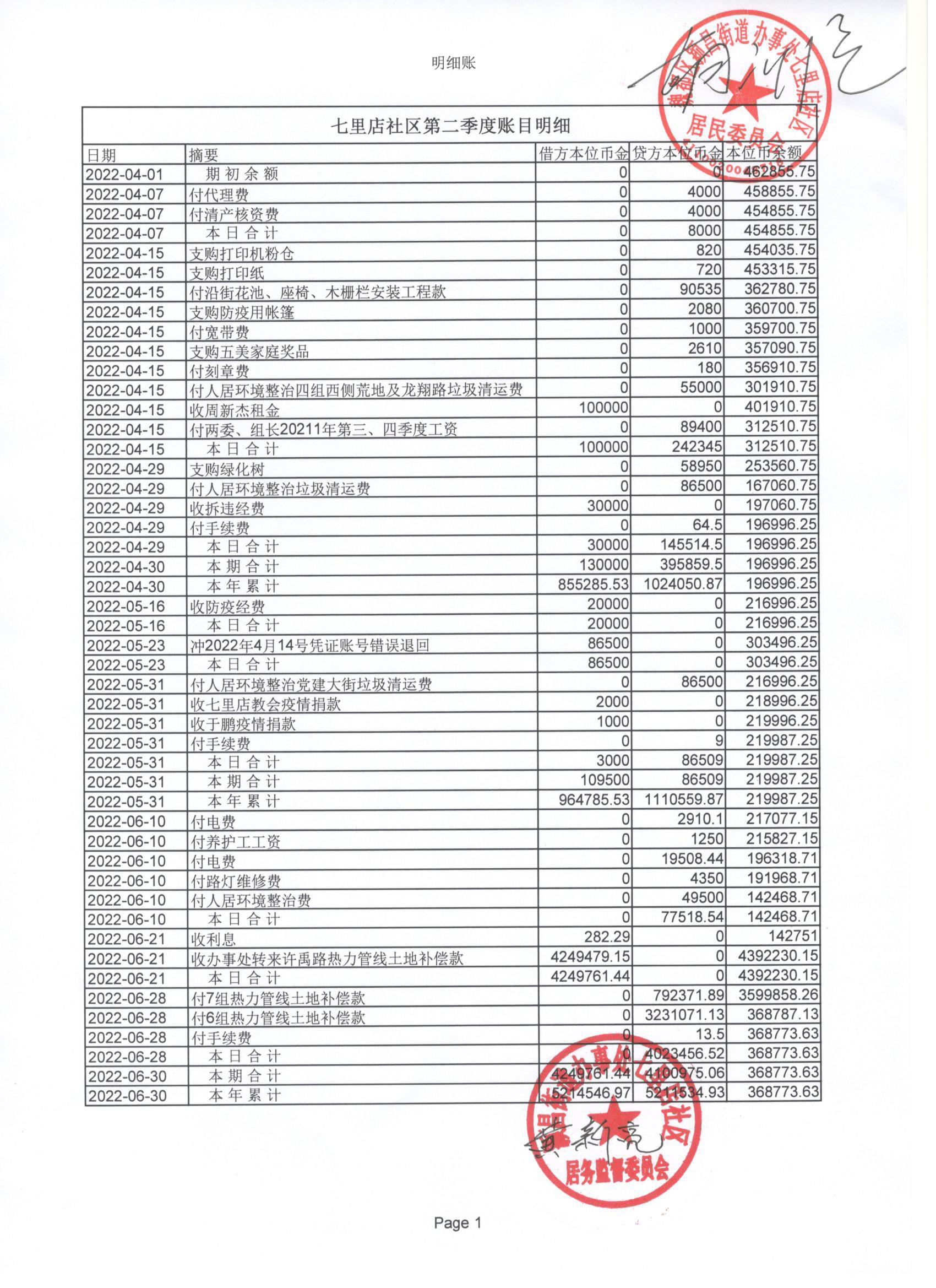 颍昌街道办事处七里店社区2022年第二季度现金、银行存款账户公开表
