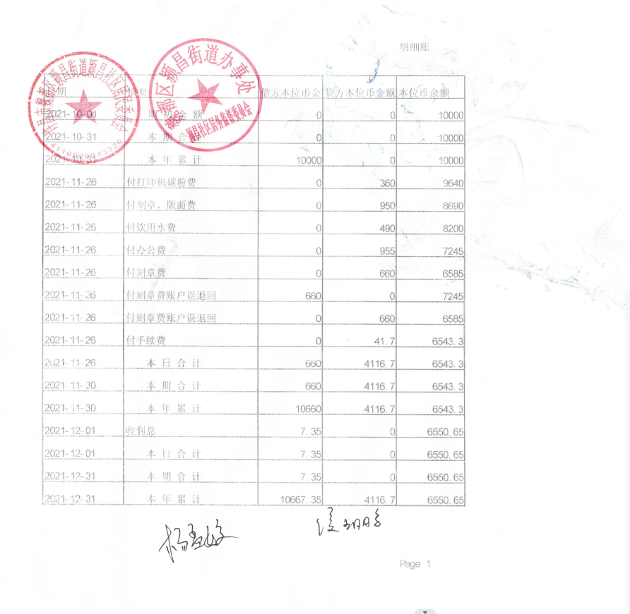 西大街道办事处豫园社区2021年第四季度银行存款账户财务公开表