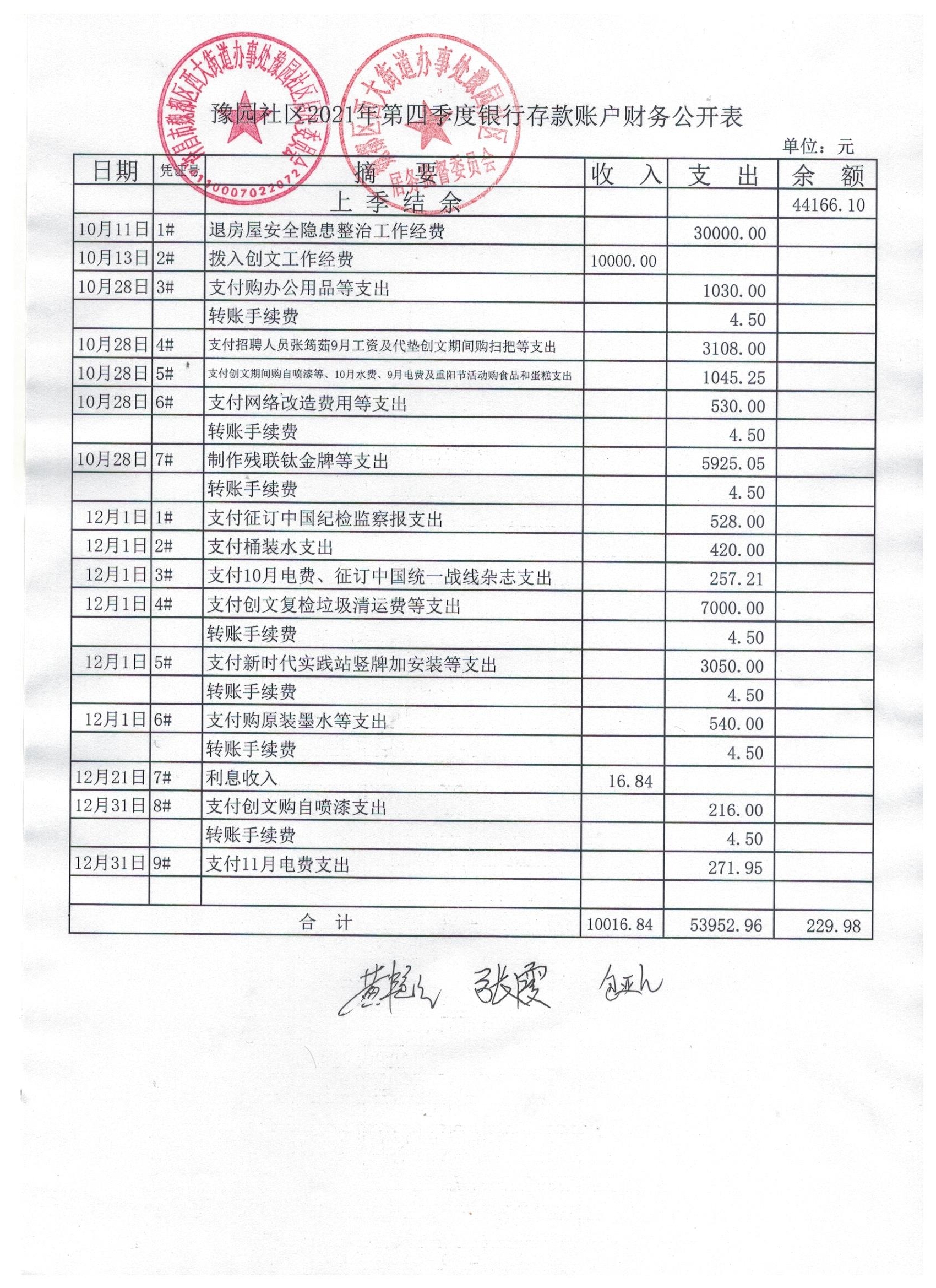 西大街道办事处豫园社区2021年第四季度银行存款账户财务公开表