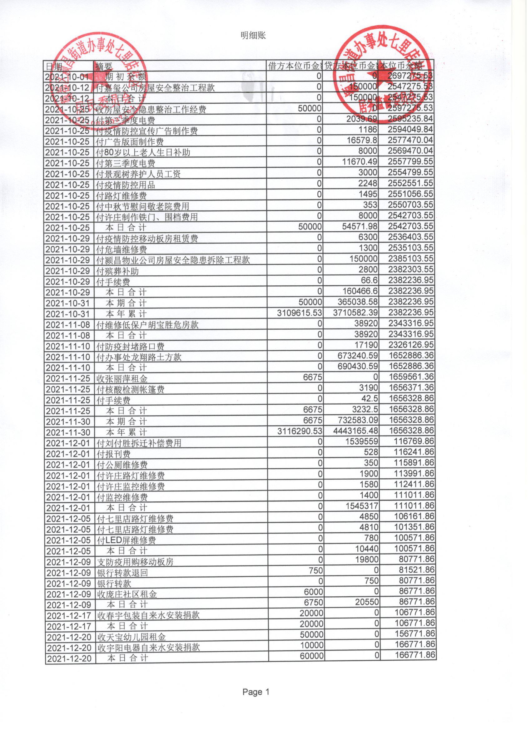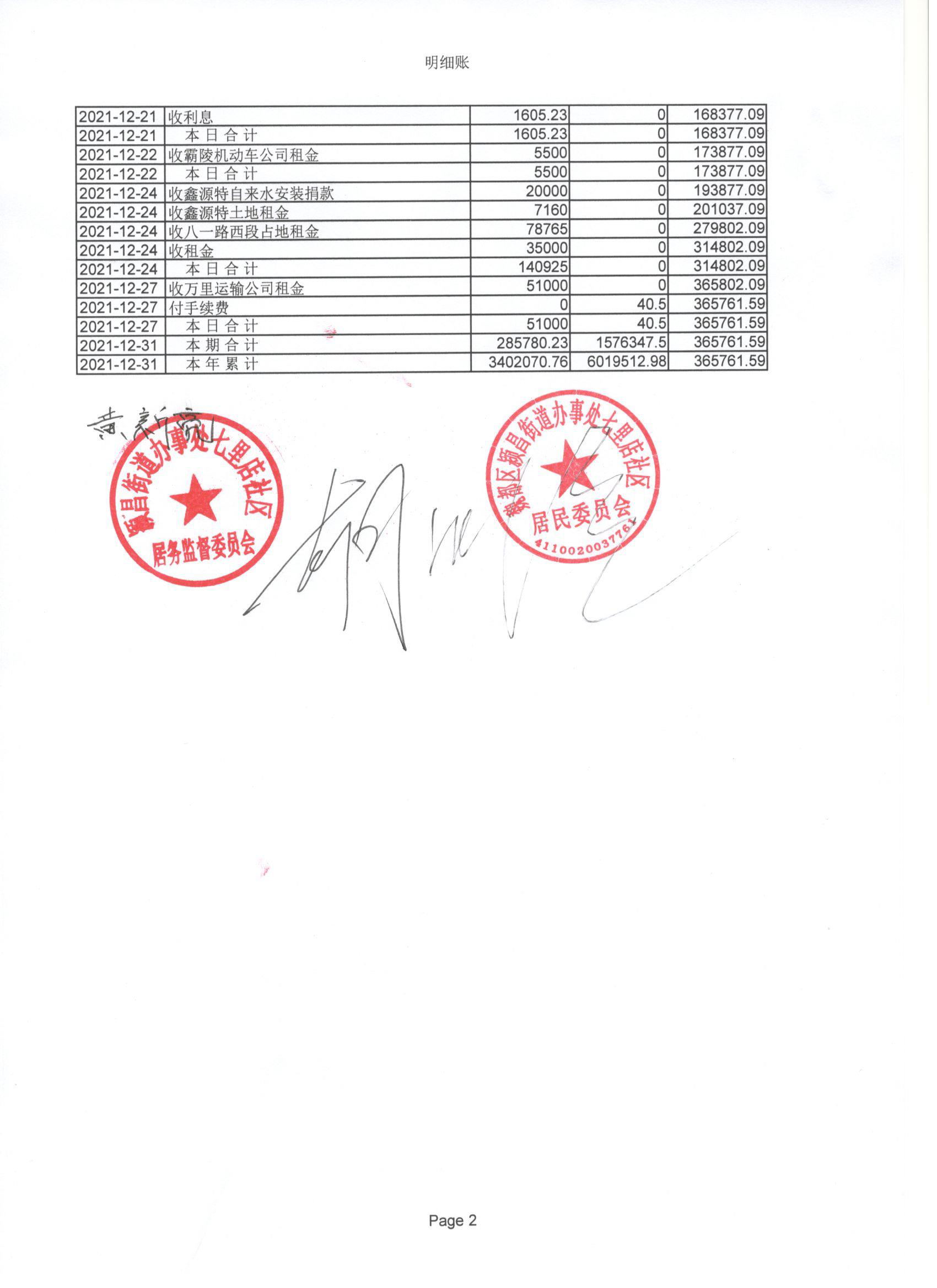 颍昌街道办事处七里店社区2021年第四季度现金、银行存款账户公开表