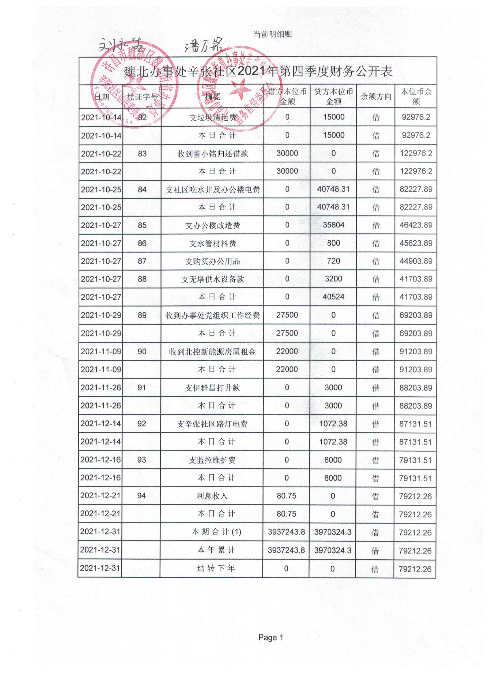 魏北办事处辛张社区2021年第四季度10-12月明细账公开表