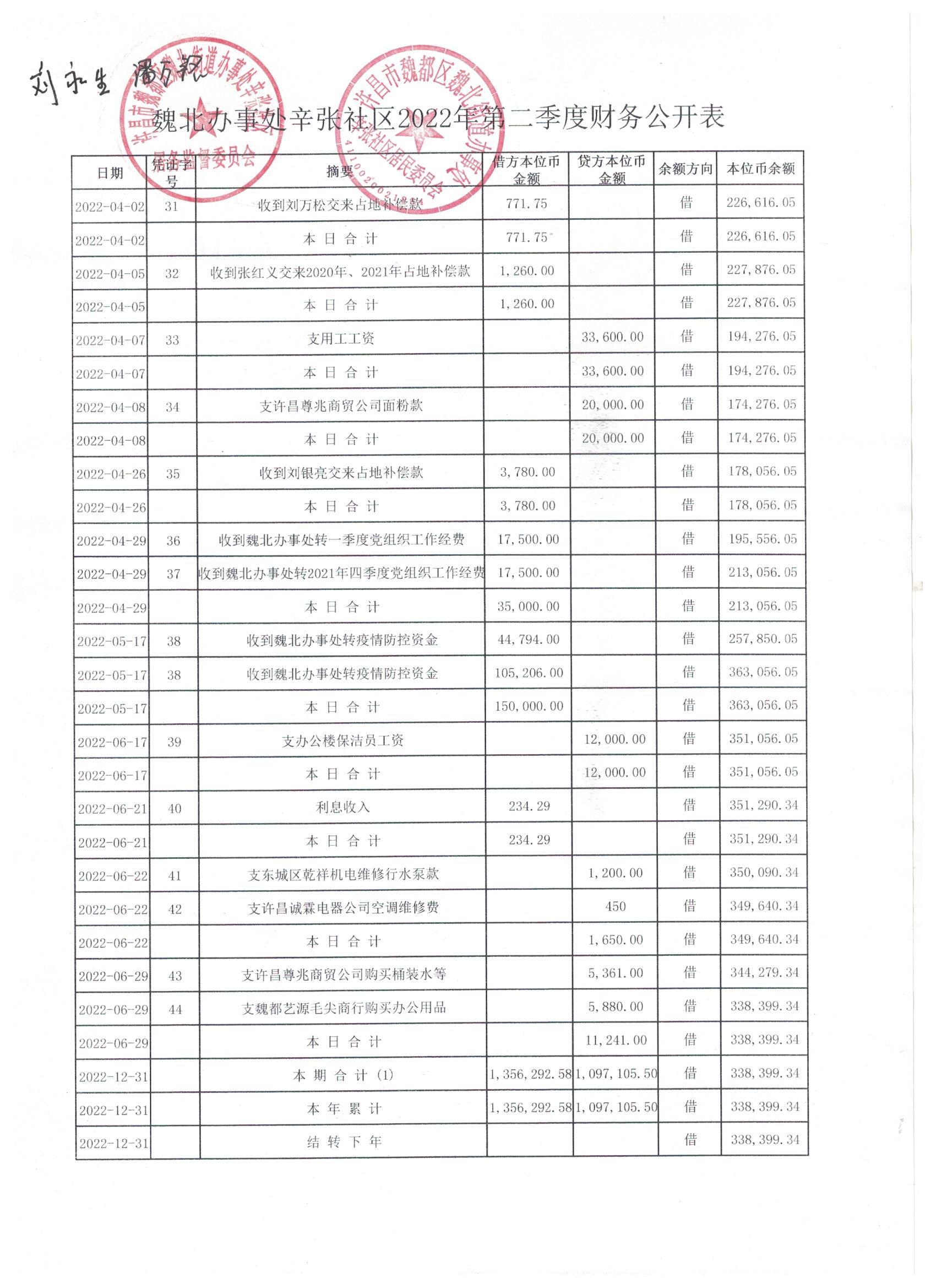魏北办事处辛张社区2022年第二季度4-6月明细账公开表