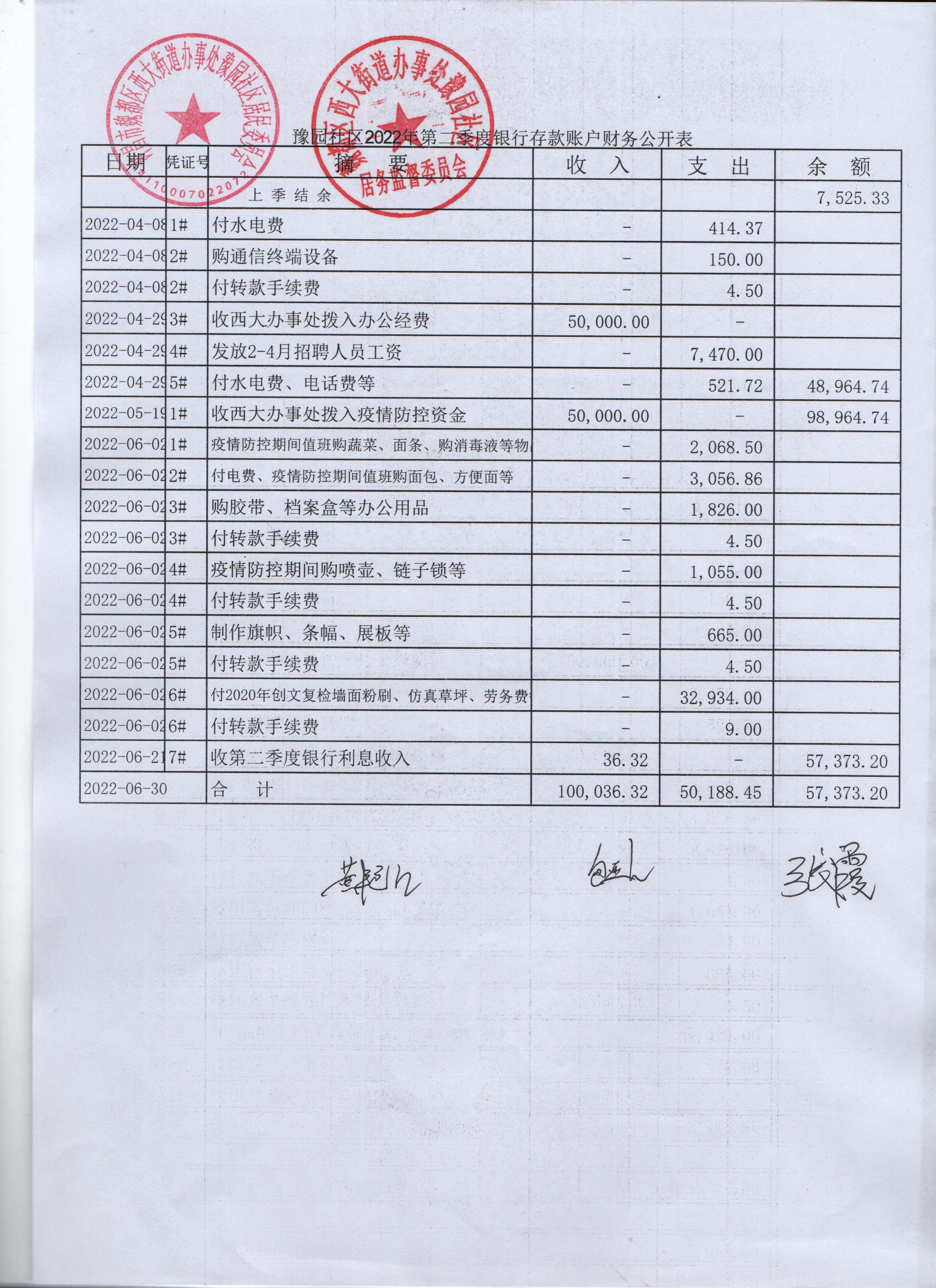西大街道办事处豫园社区2022年第二季度银行存款账户财务公开表