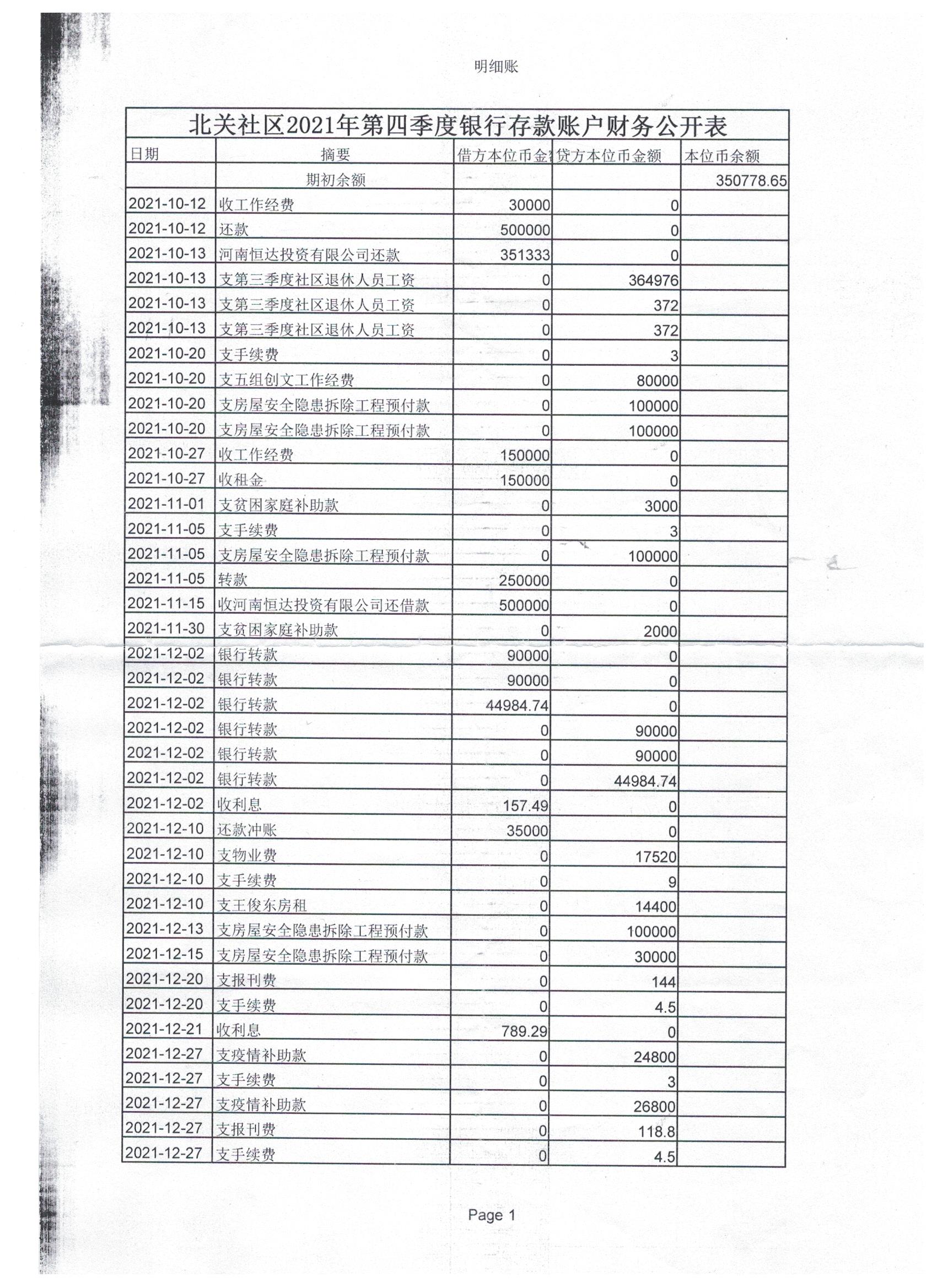 丁庄办事处北关社区2021年第四季度银行存款账户公开表