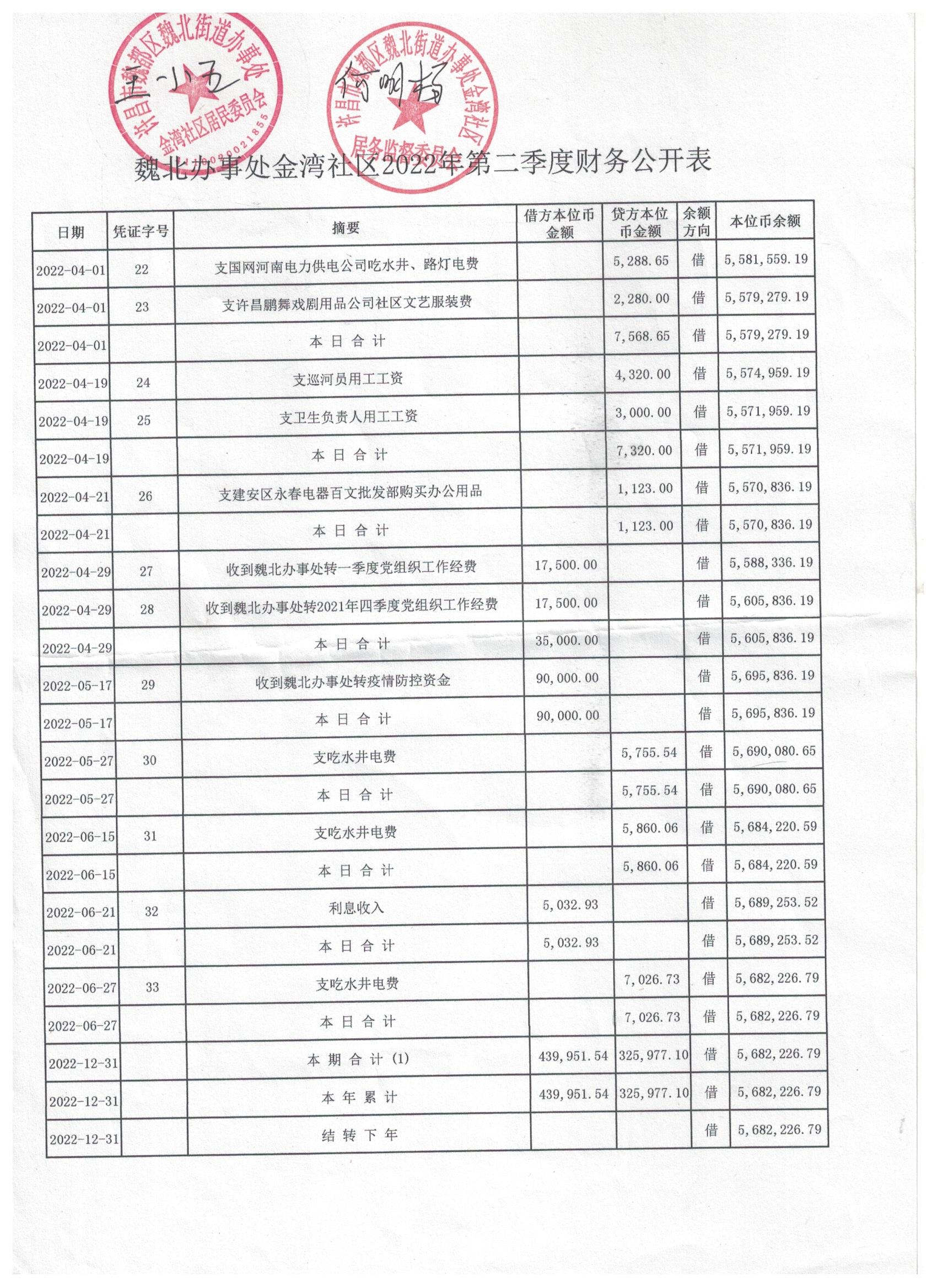 魏北办事处金湾社区2022年第二季度4-6月明细账公开表