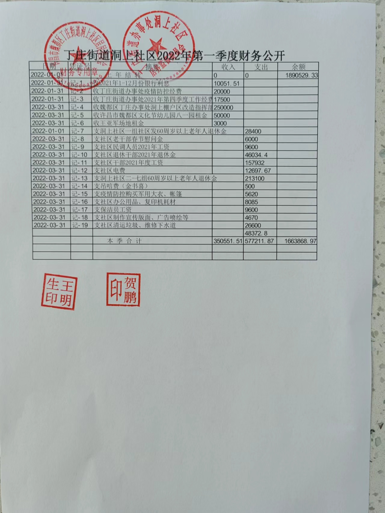 丁庄办事处洞上社区2022年第一季度银行存款账户公开表