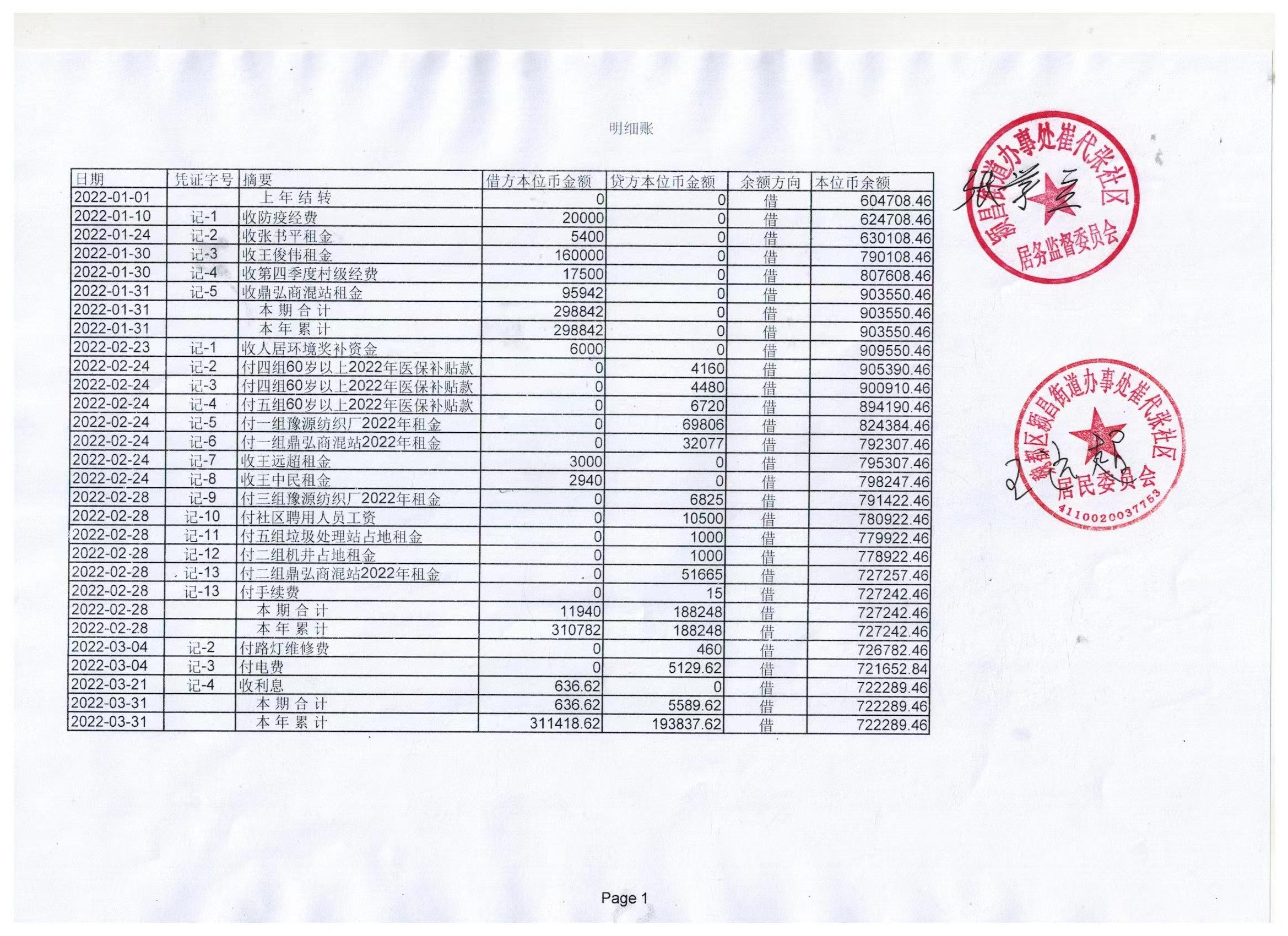 颍昌街道办事处崔代张社区2022年第一季度现金、银行存款账户公开表