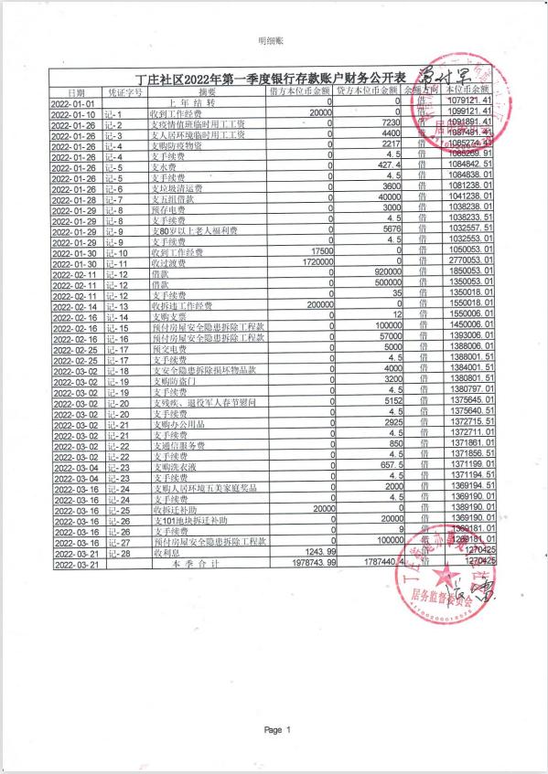 丁庄办事处丁庄社区2022年第一季度银行存款账户公开表