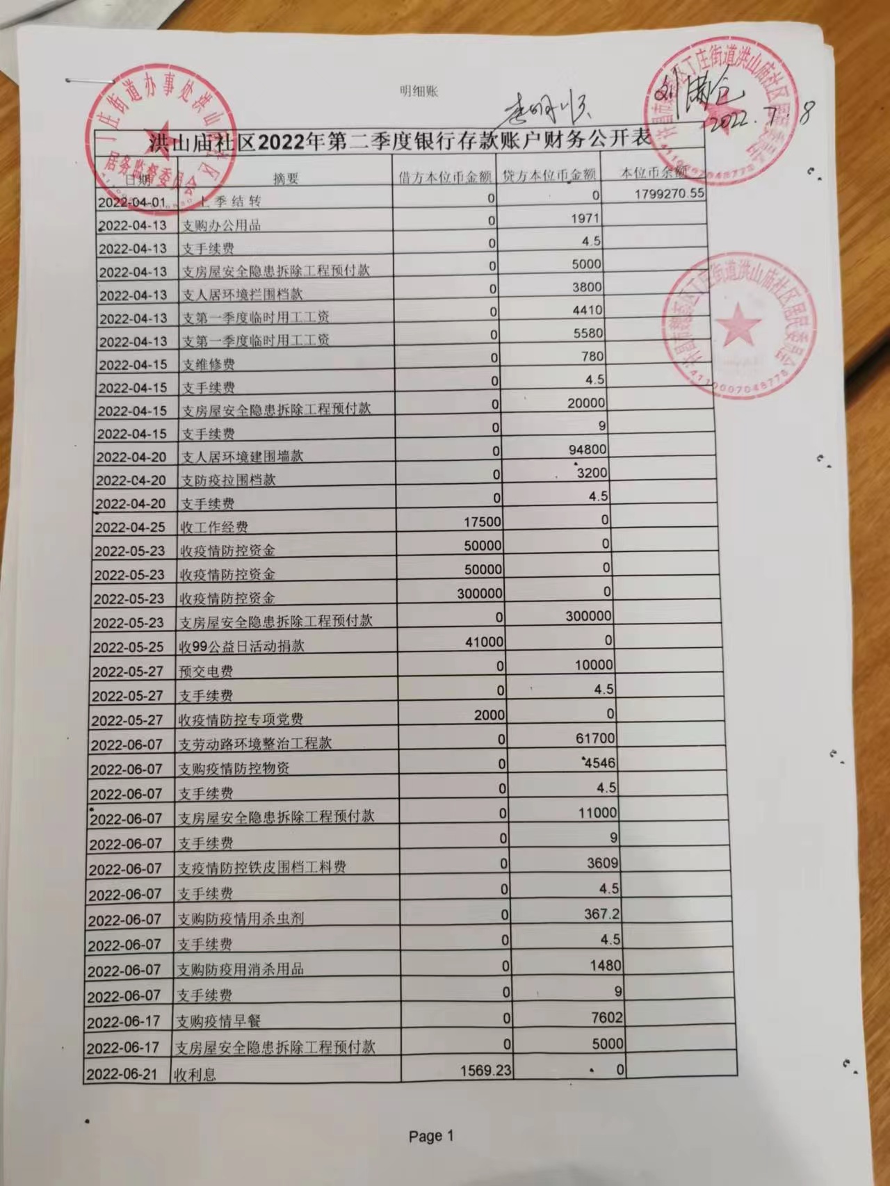 丁庄办事处洪山庙社区2022年第二季度银行存款账户公开表