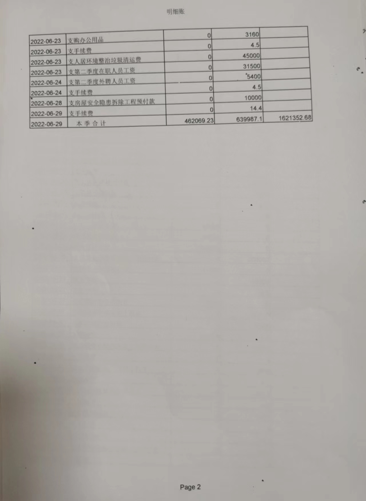 魏北办事处郭楼社区第三季度财务公开