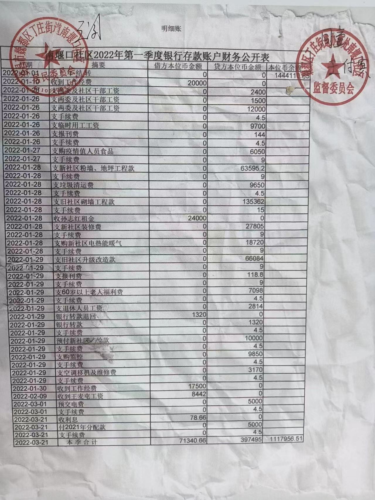 丁庄办事处南堰口社区2022年第一季度银行存款账户公开表