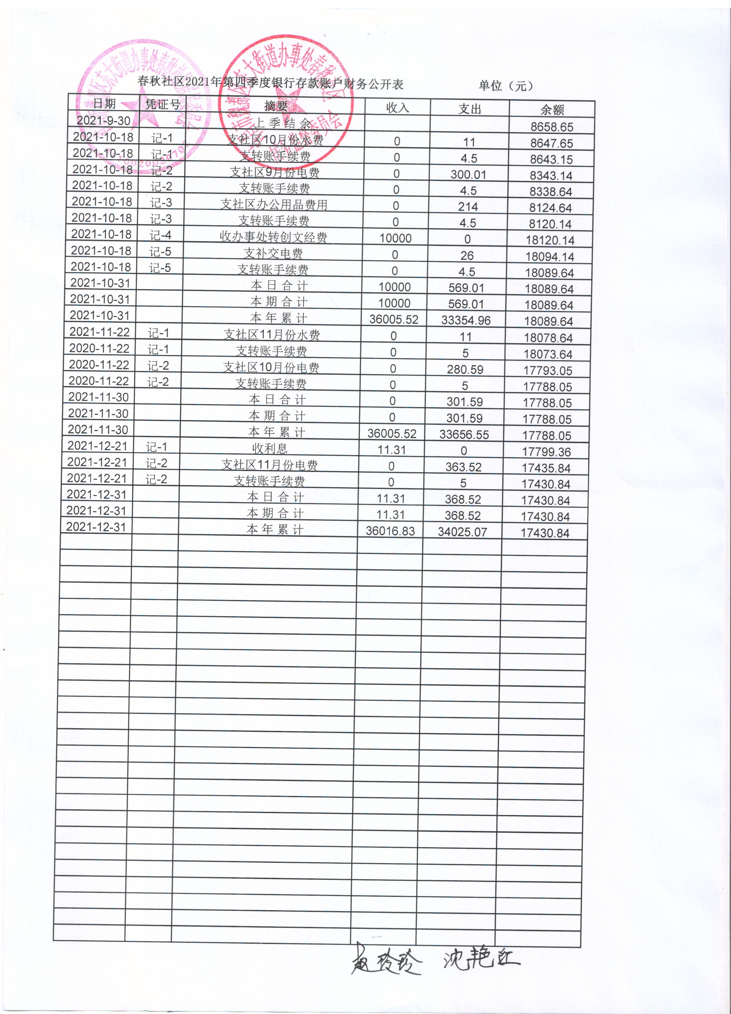 东大街道办事处春秋社区2021年第四季度银行存款账户财务公开表
