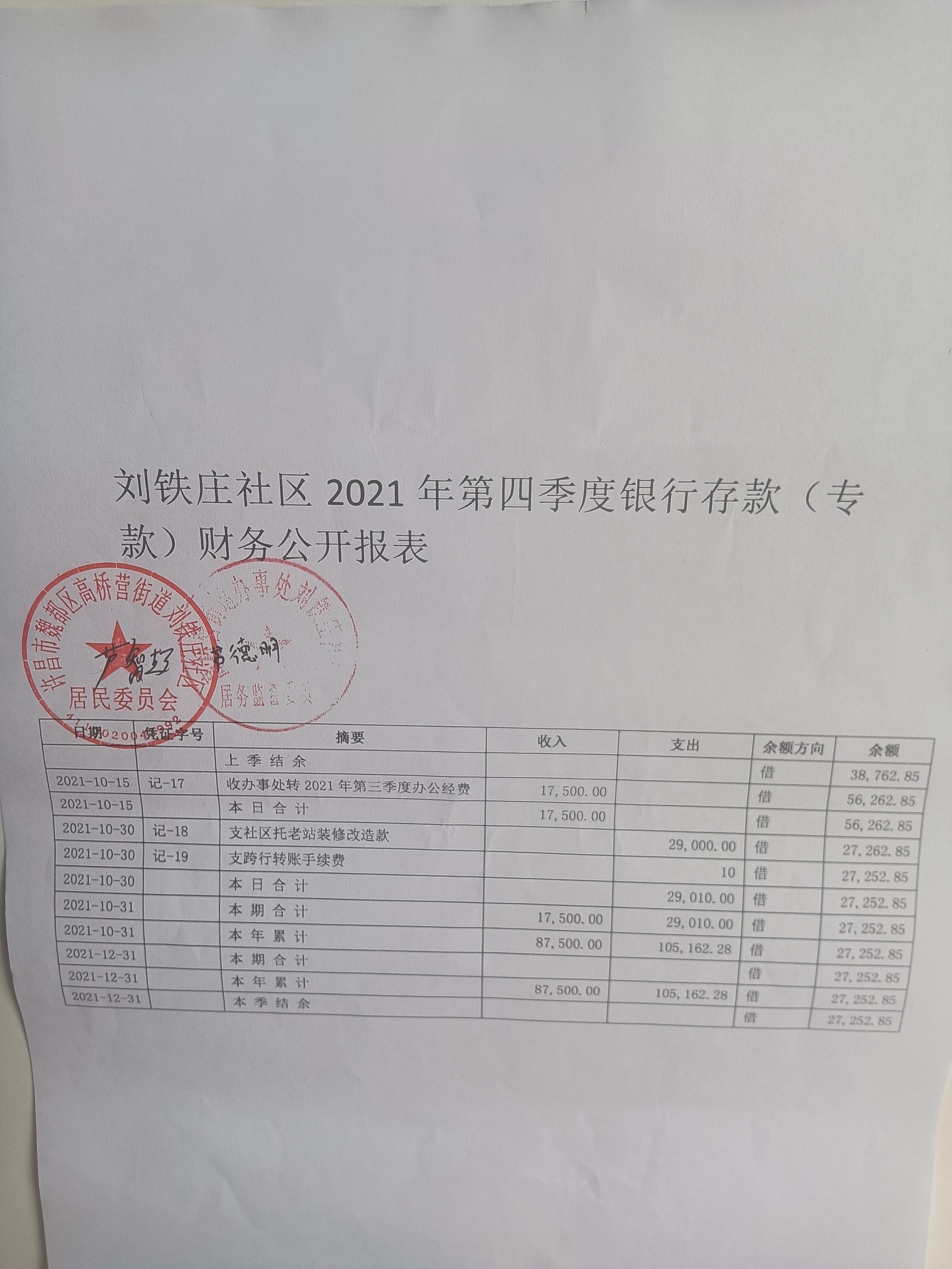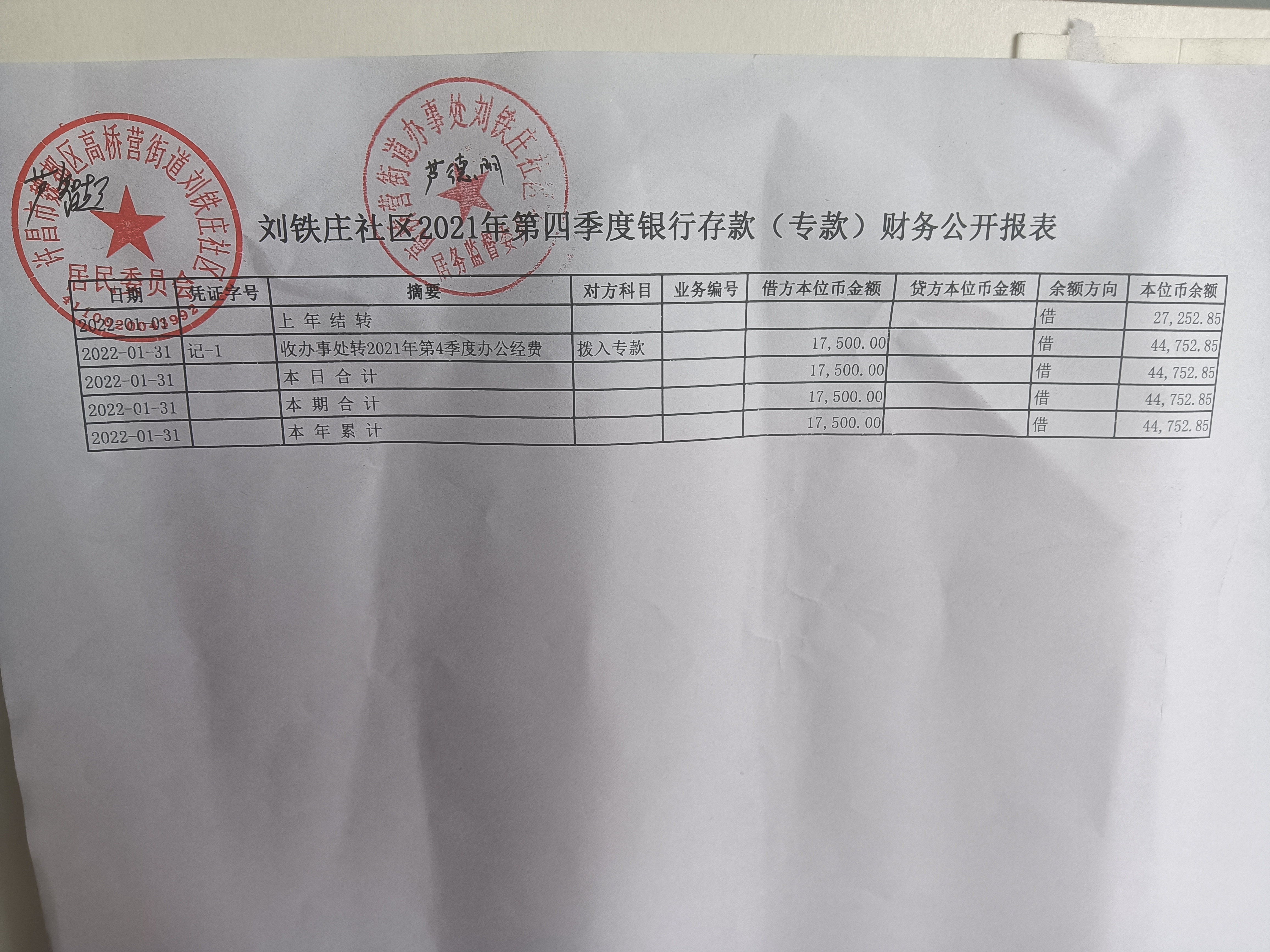 高桥营街道办事处刘铁庄社区2021年第四季度银行存款账户公开表