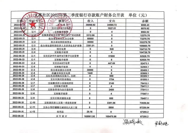 东大街道办事处文惠社区2022年第二季度银行存款账户财务公开表