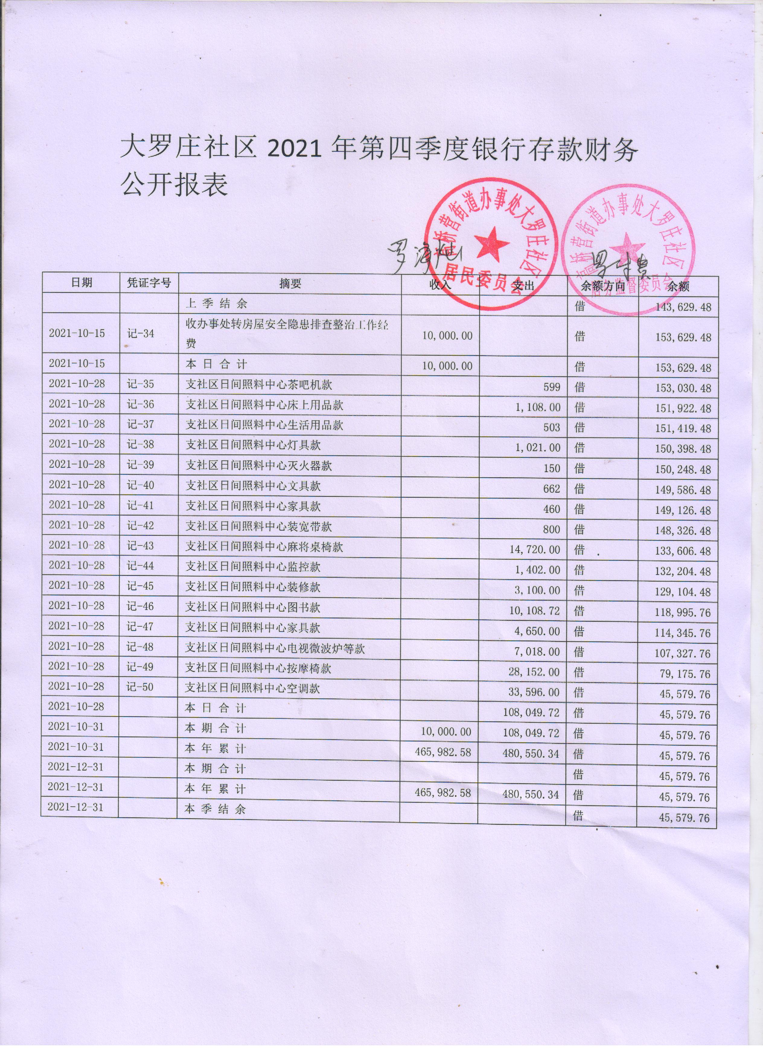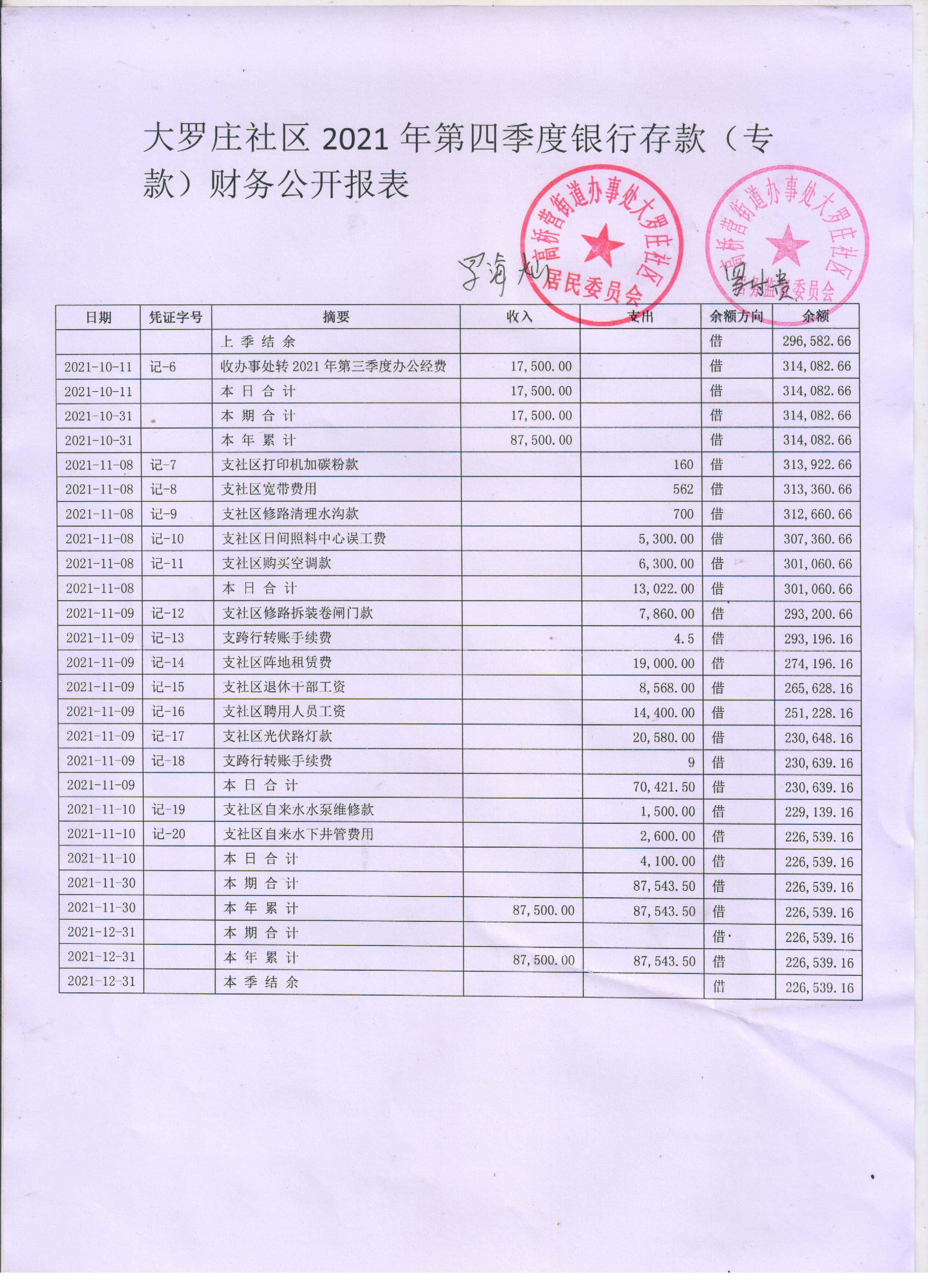 高桥营街道办事处大罗庄社区2021年第四季度银行存款账户公开表