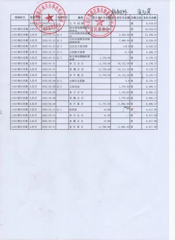 南关街道办事处凭心社区2022年第1季度银行存款公开表