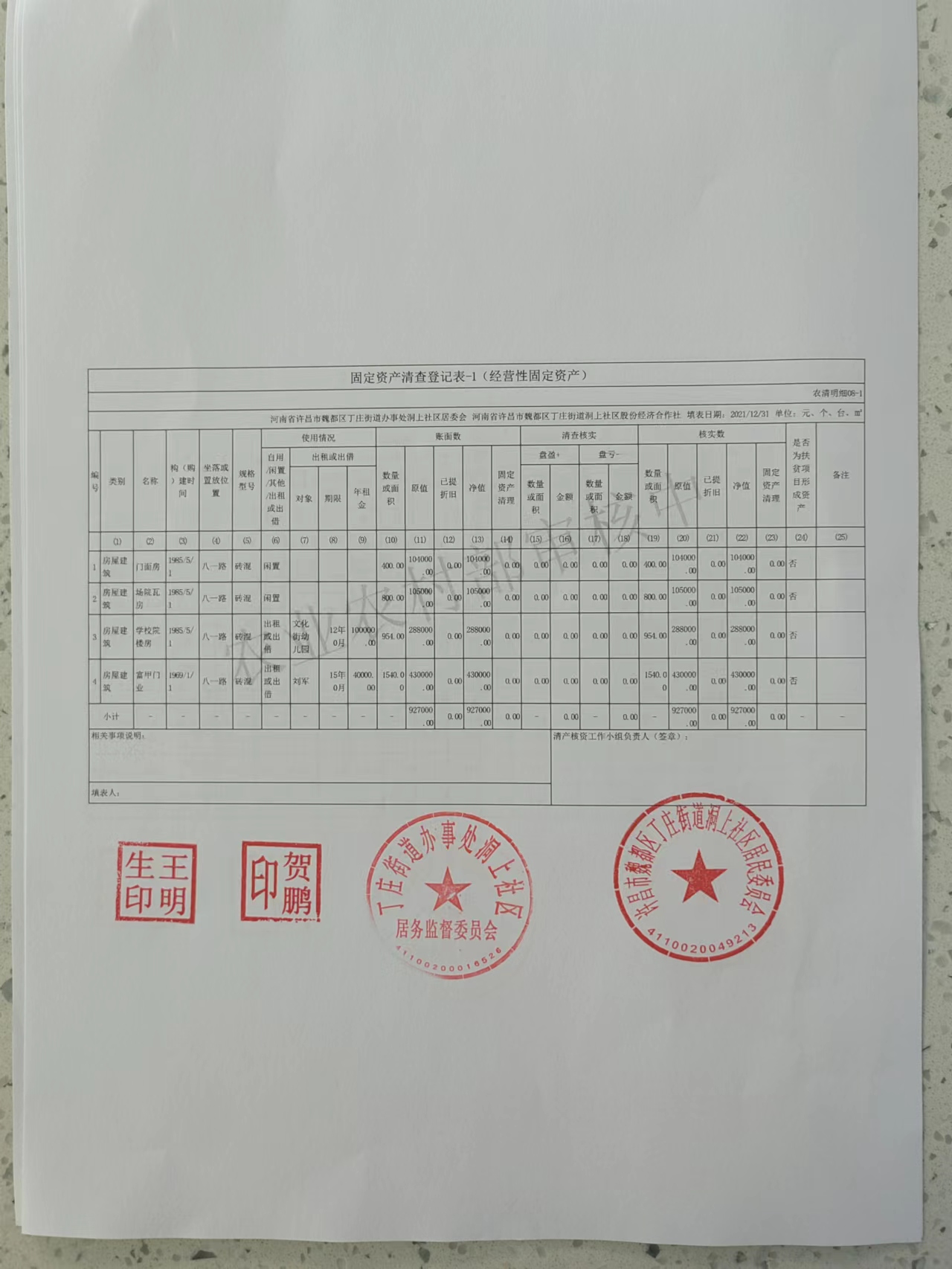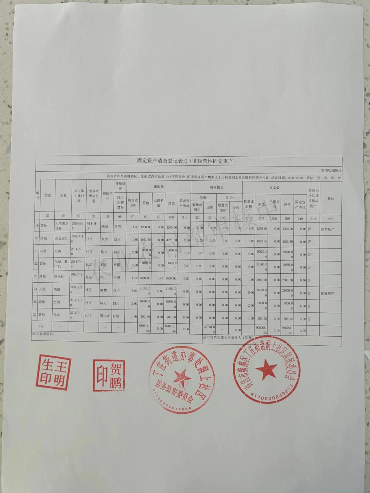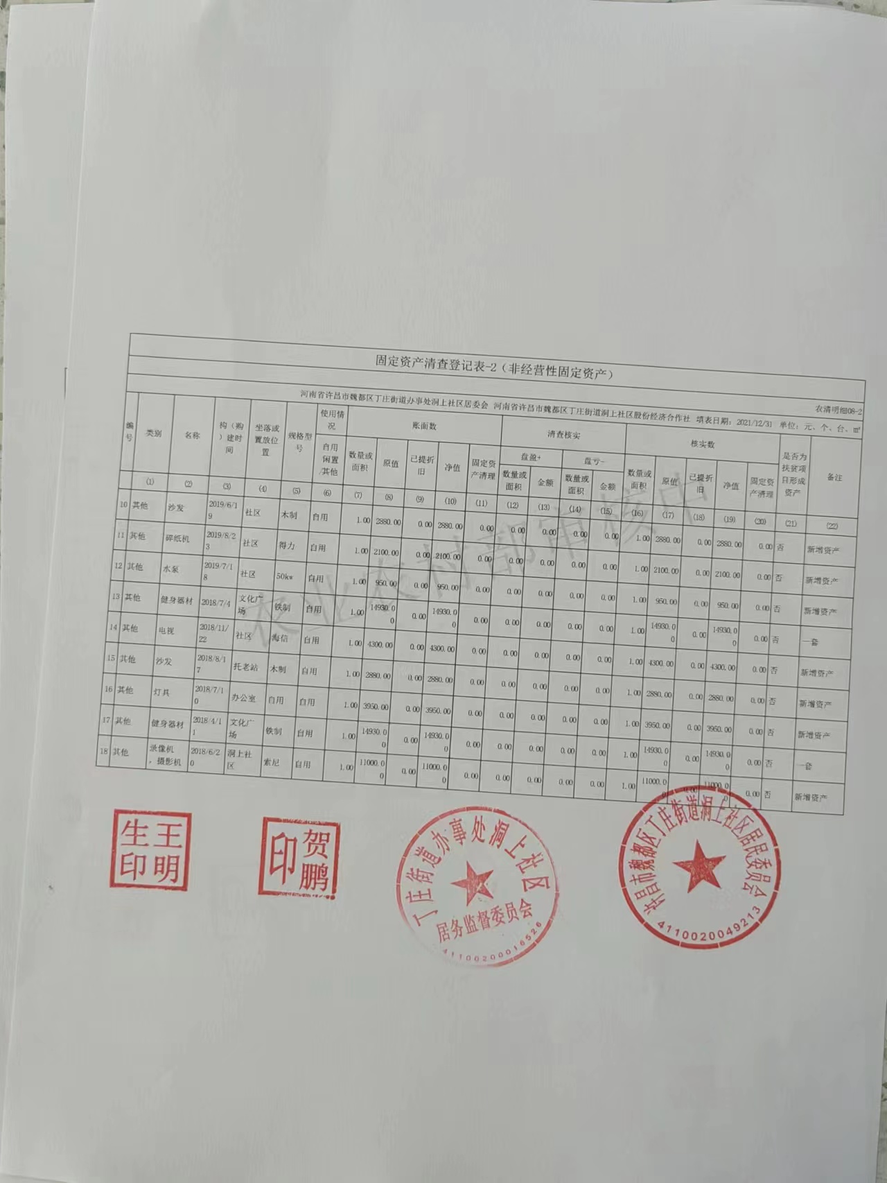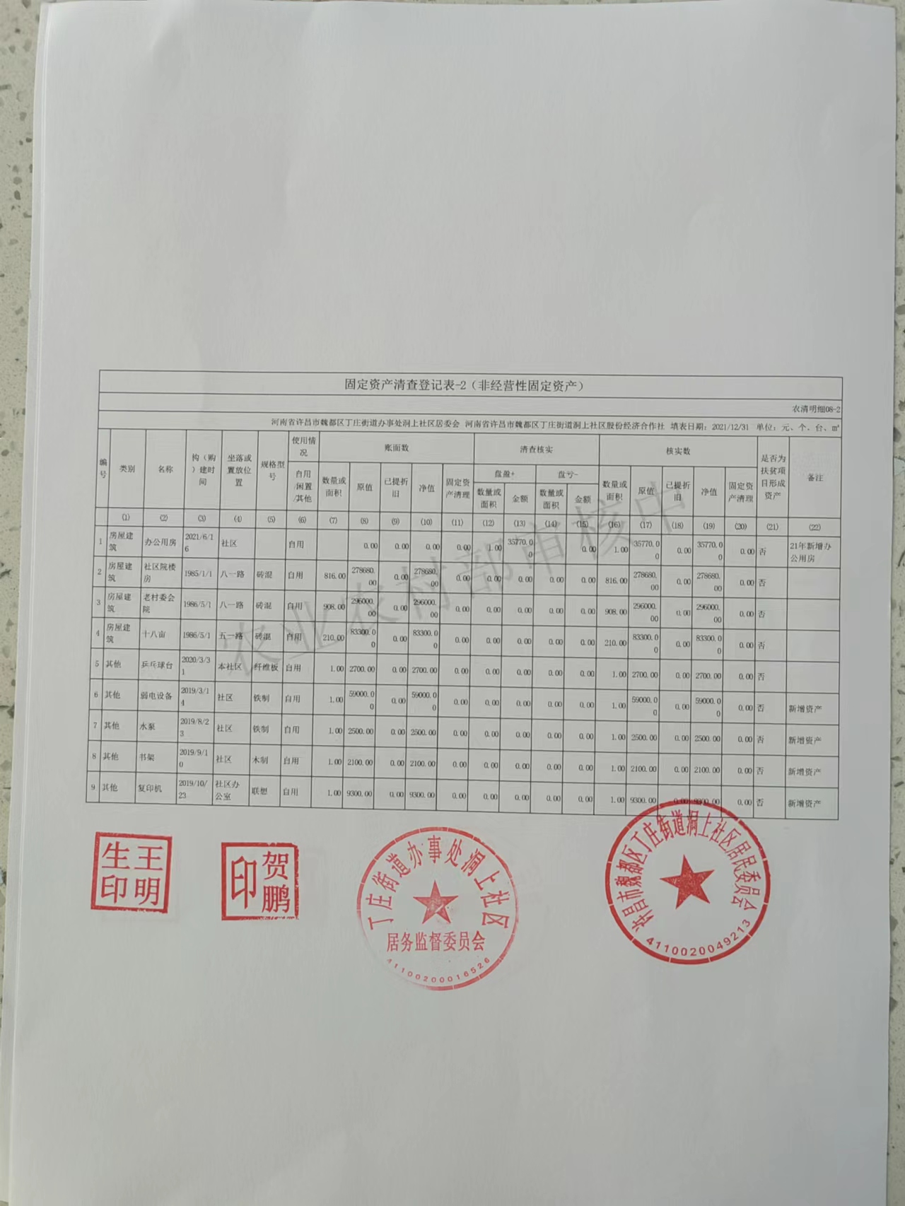 丁庄办事处洞上社区2021年固定资产明细