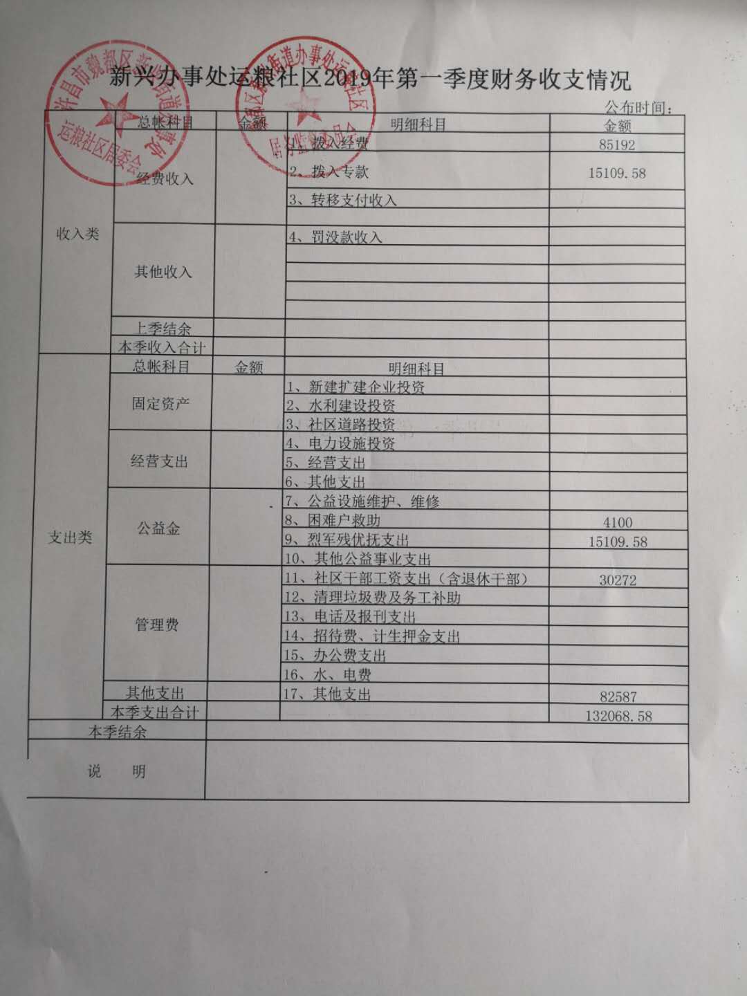 新兴办事处运粮社区2019年第一季度财务公开表
