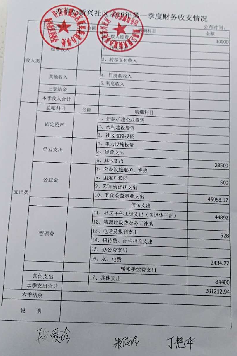 新兴办事处新兴社区2019年第一季度财务公开表