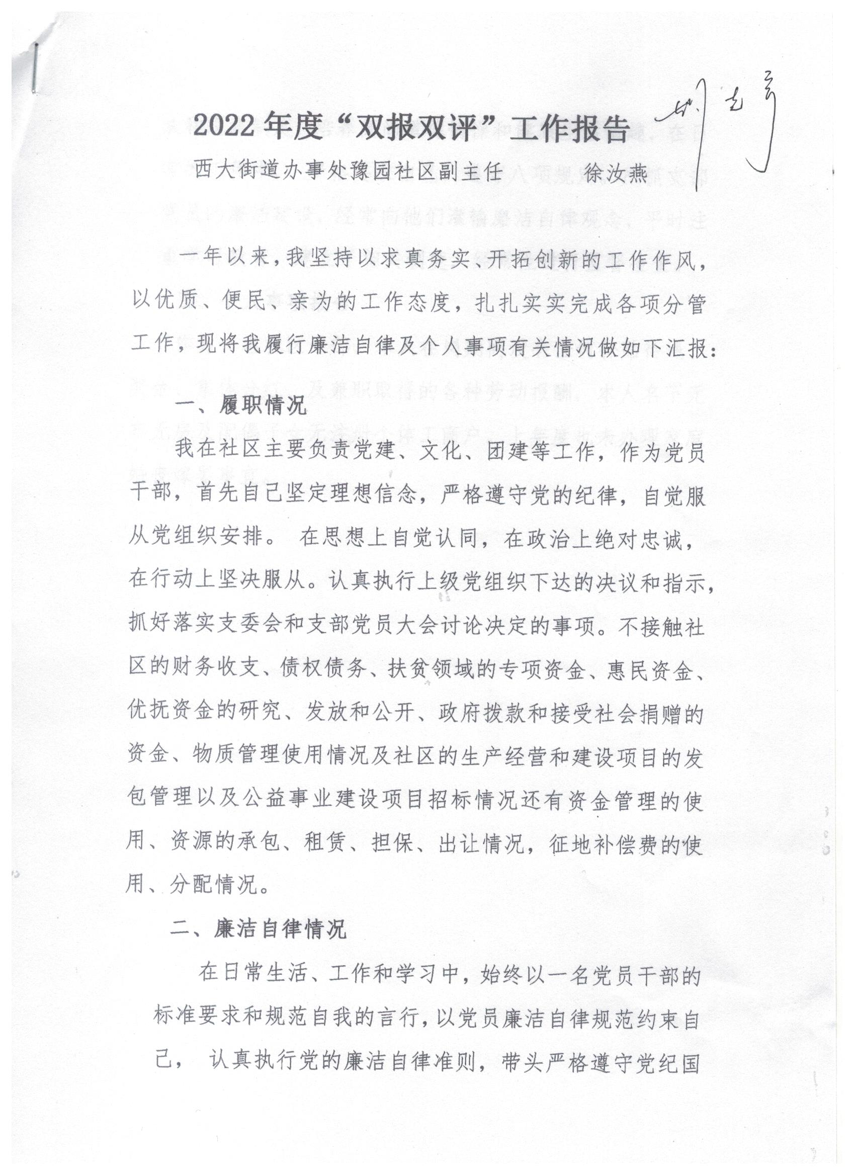 豫园社区徐汝燕2022年度双报双评个人情况报告