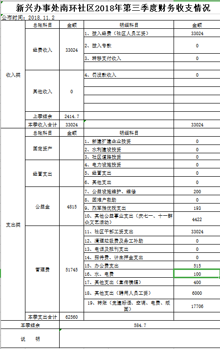 新兴办事处祥泰社区2018年第三季度财务公开表