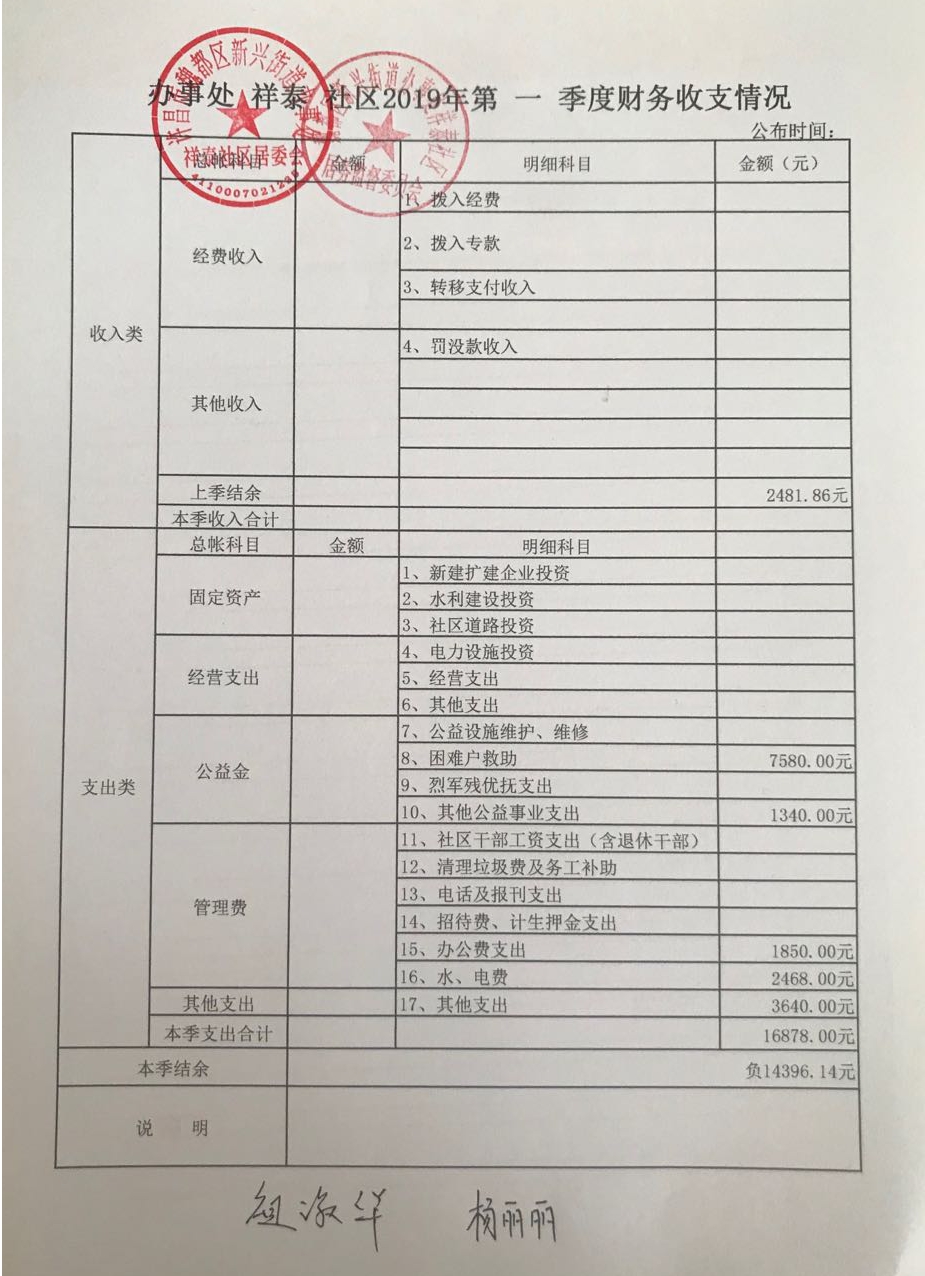 新兴办事处祥泰社区2019年第一季度财务公开表