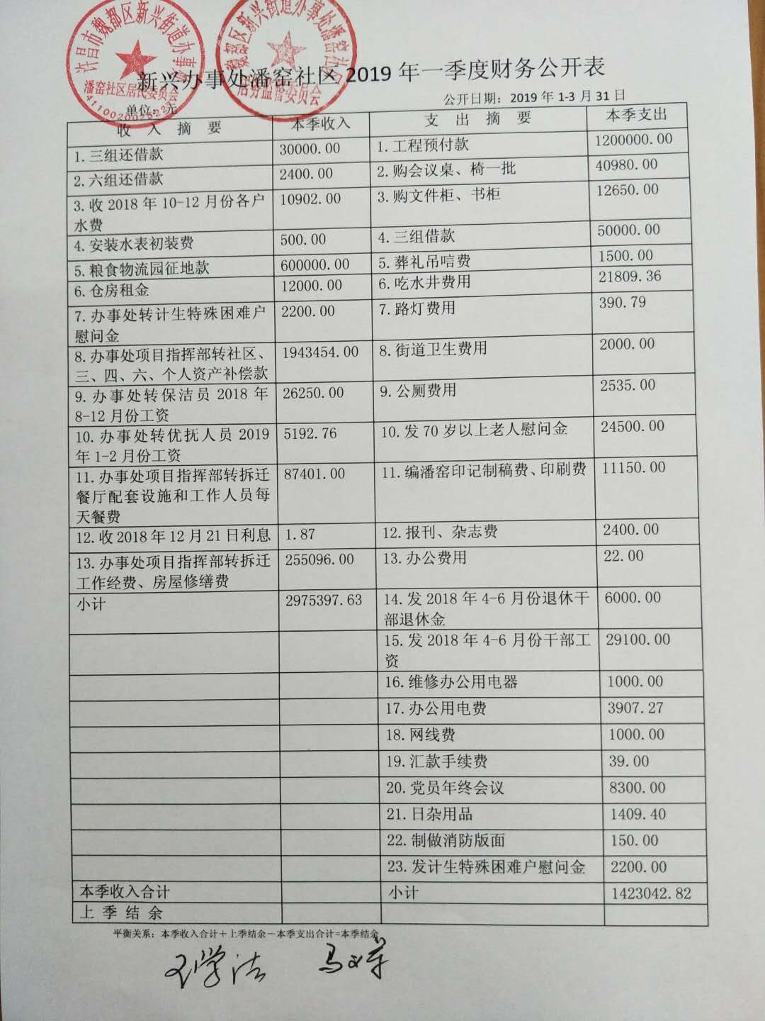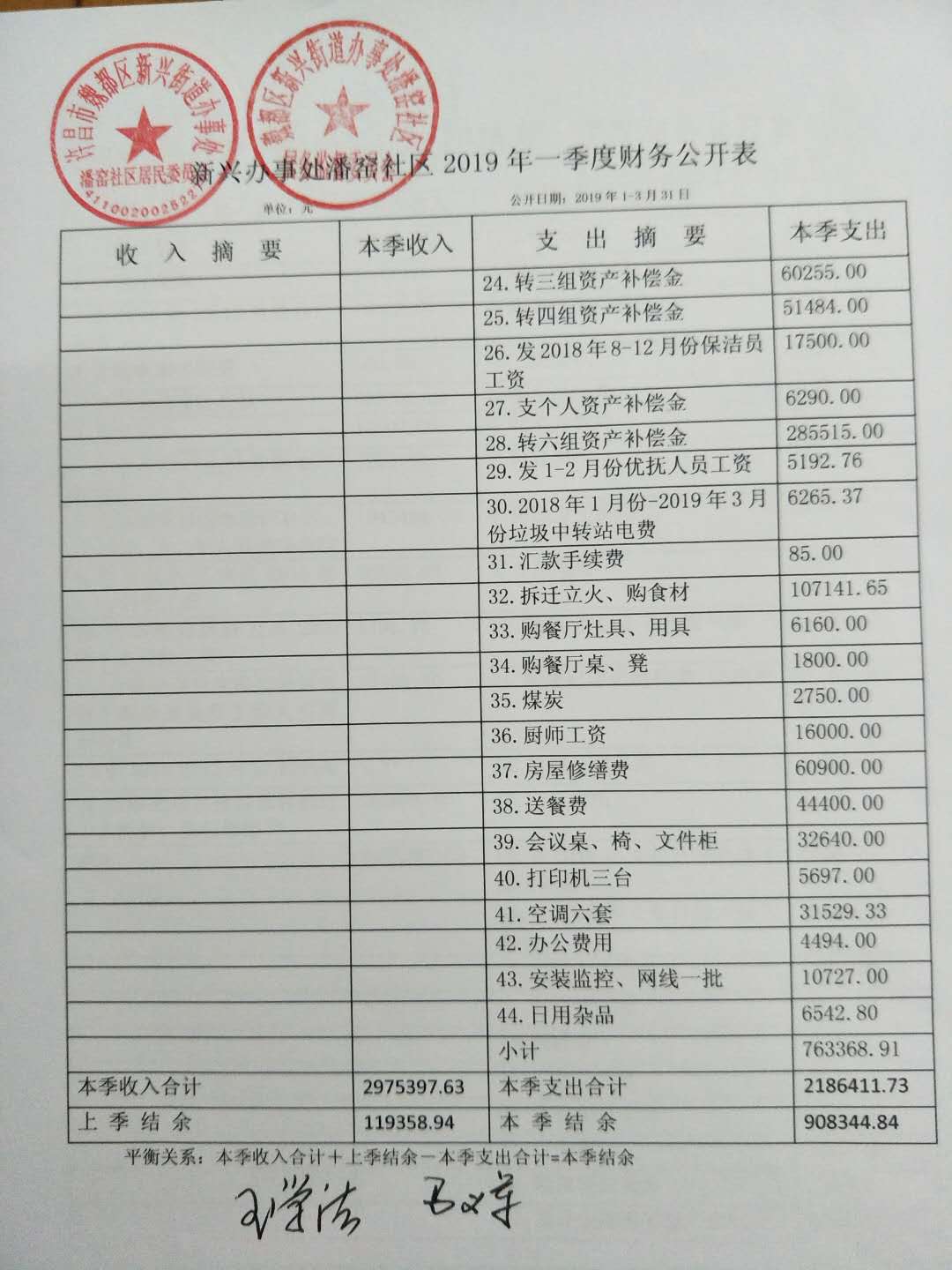 新兴办事处潘窑社区2019年第一季度财务公开表