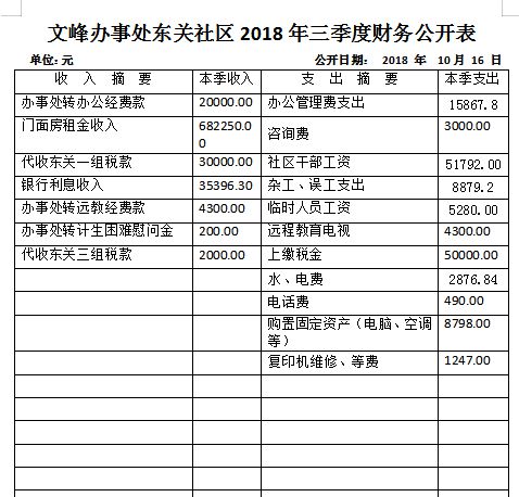 文峰办事处东关社区2018年第三季度财务公开表