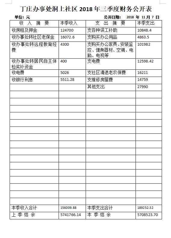 丁庄办事处洞上社区2018年第三季度财务公开表