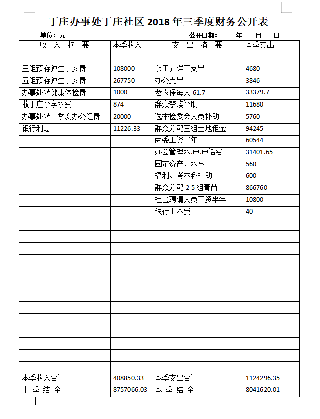 丁庄办事处丁庄社区2018年第三季度财务公开表