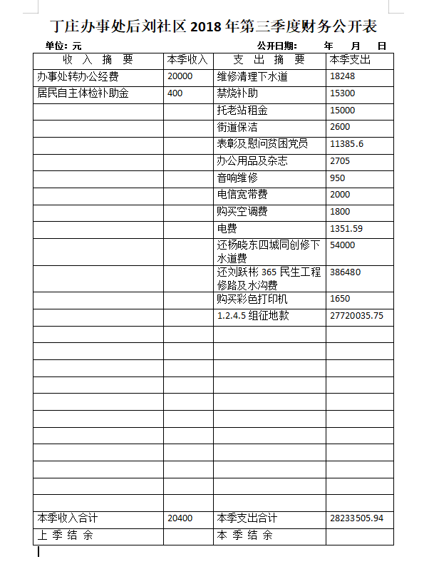 丁庄办事处后刘社区2018年第三季度财务公开表