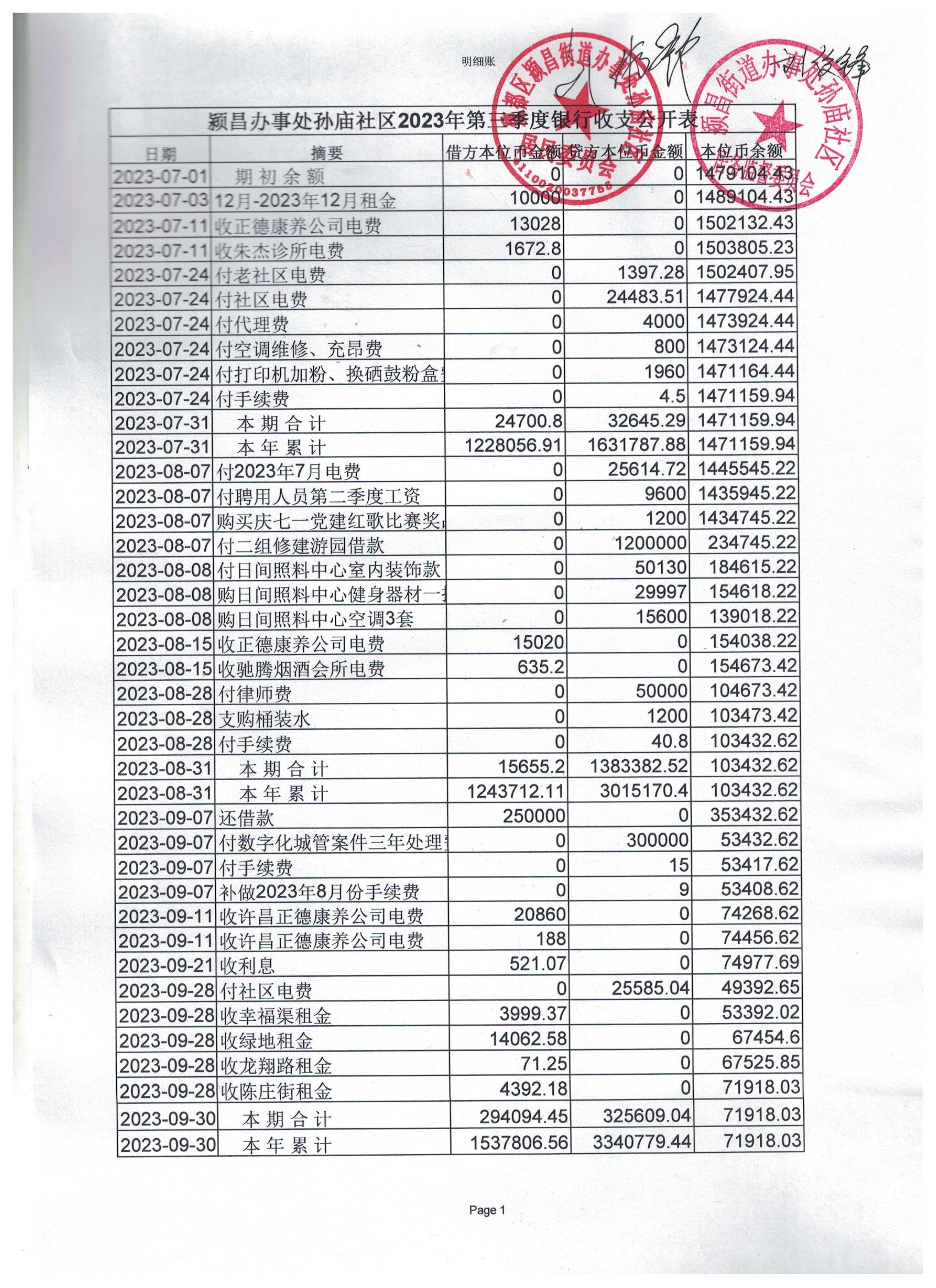 颍昌办事处孙庙社区2023年第三季度银行存款收支公开表