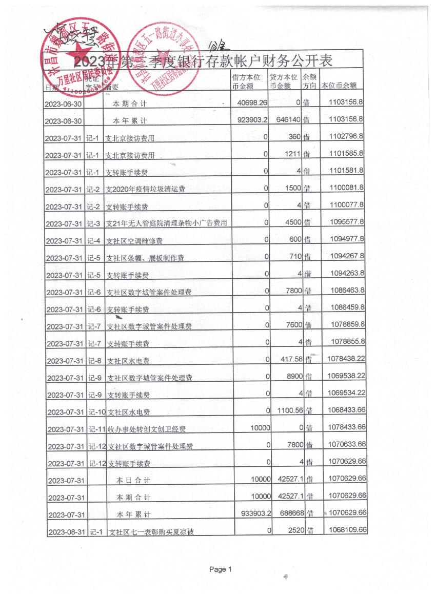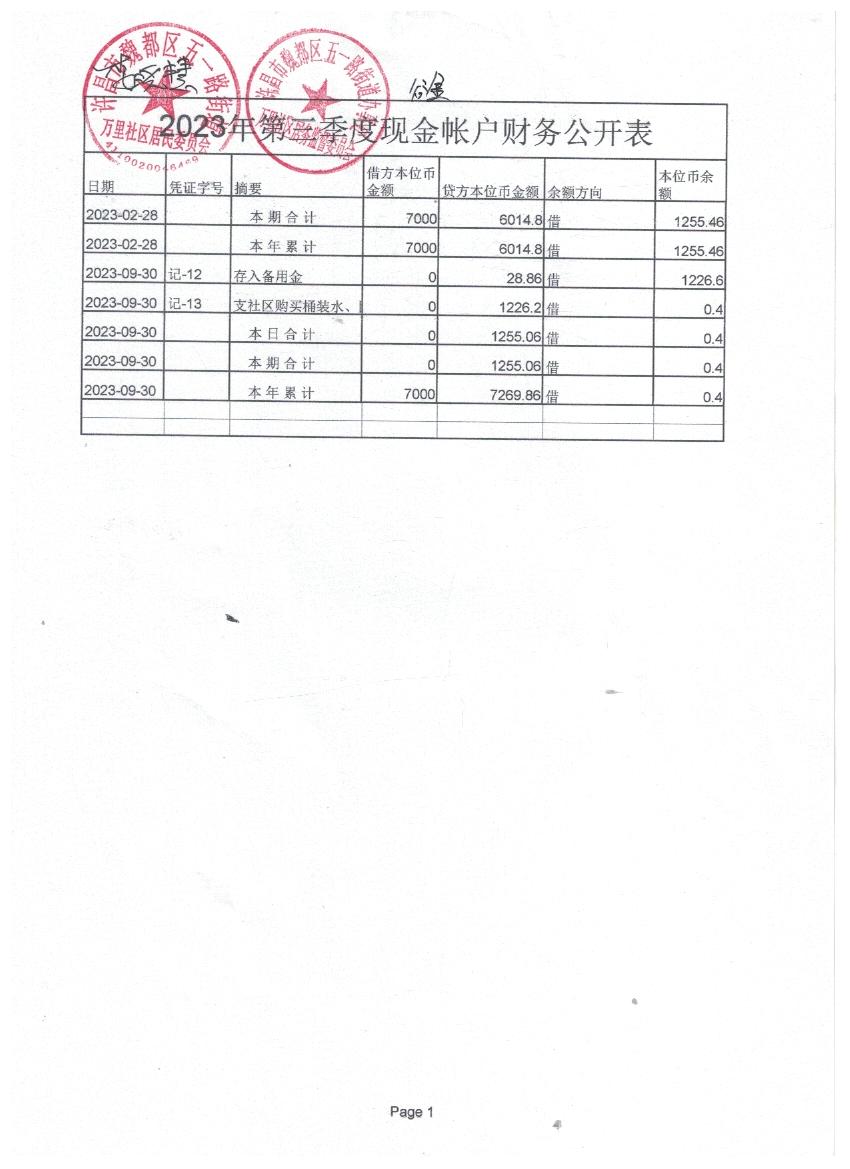 五一路办事处万里社区第三季度现金、银行存款收支公开表
