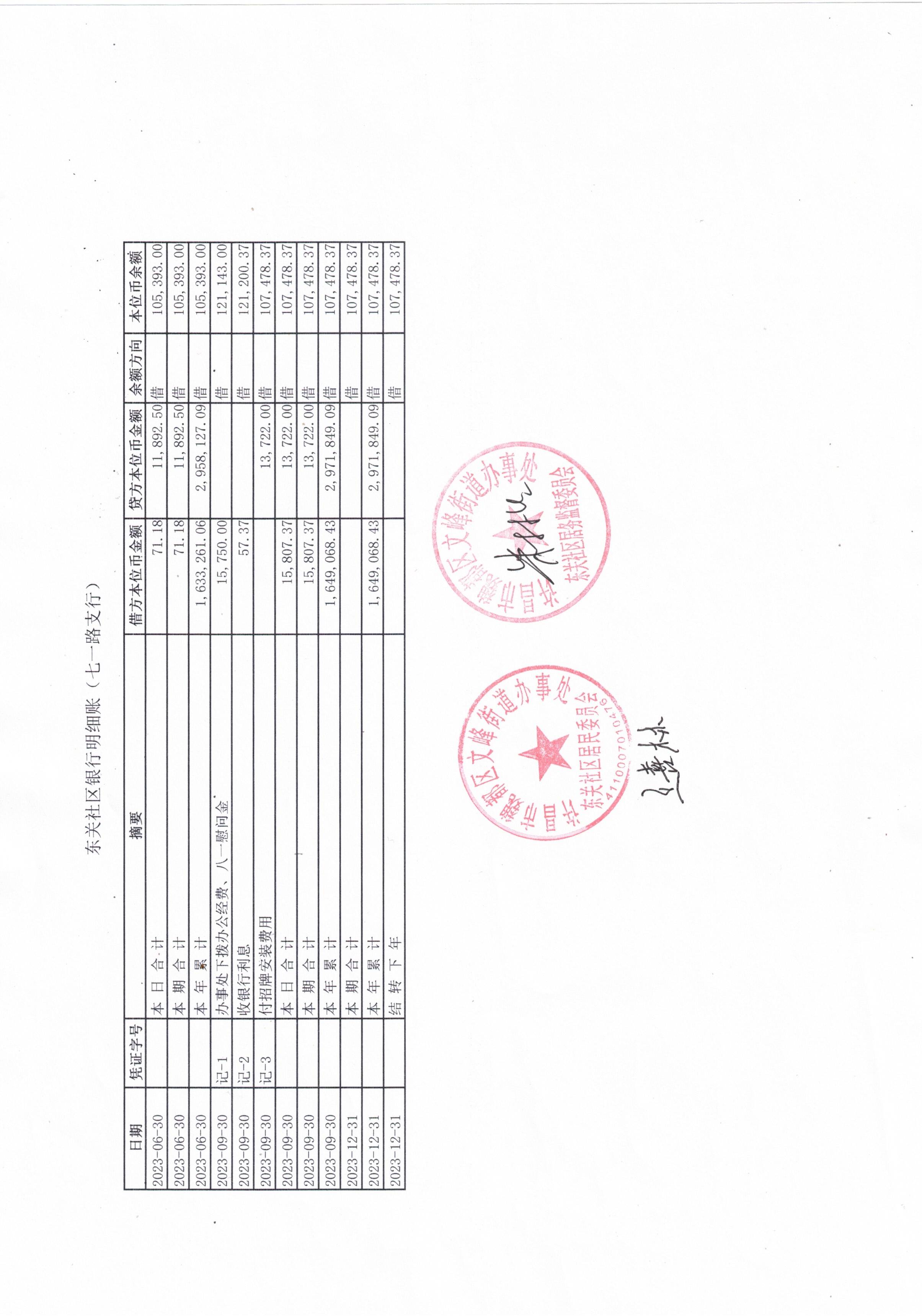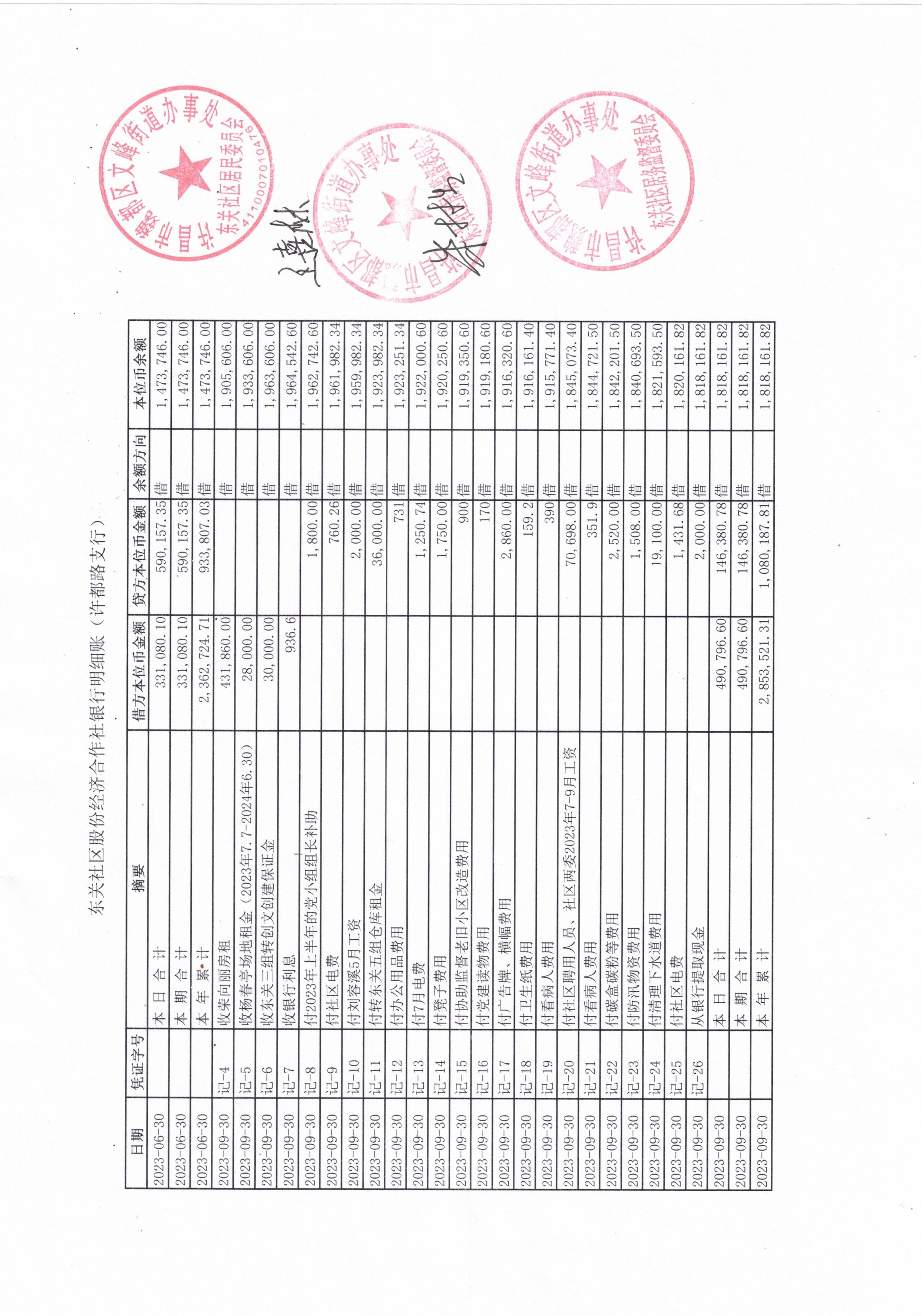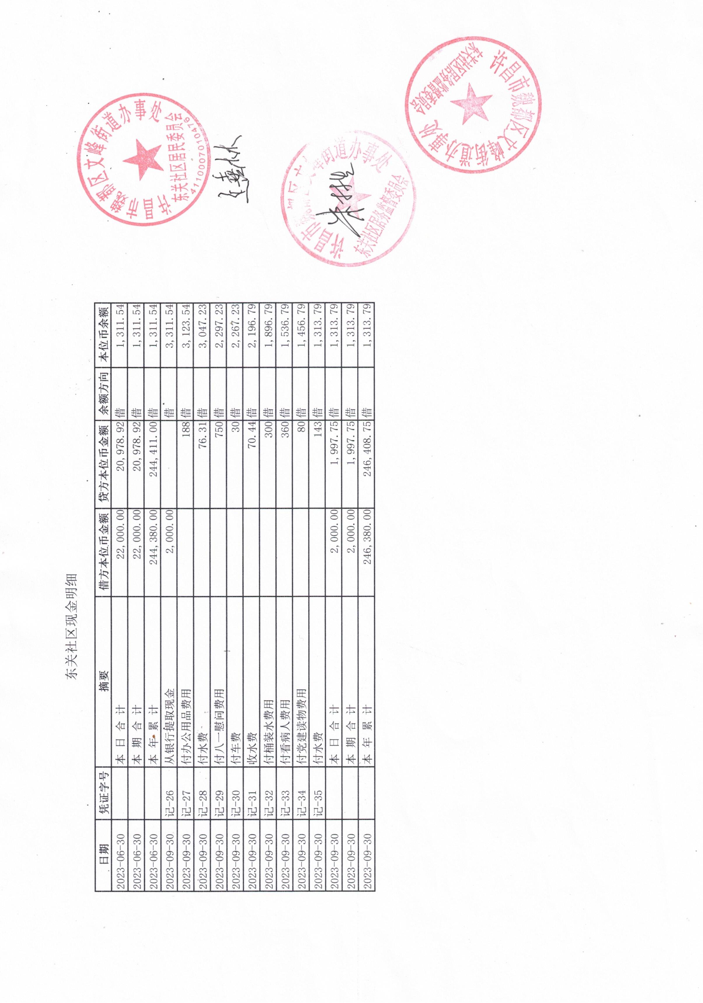 文峰办事处东关社区2023年第三季度现金、银行存款收支公开表