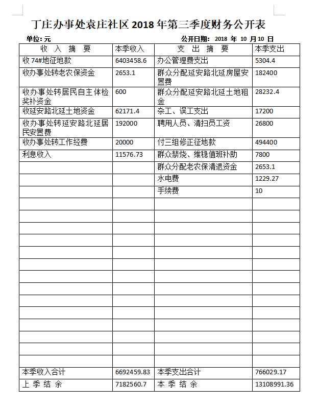 丁庄办事处袁庄社区2018年第三季度财务公开表