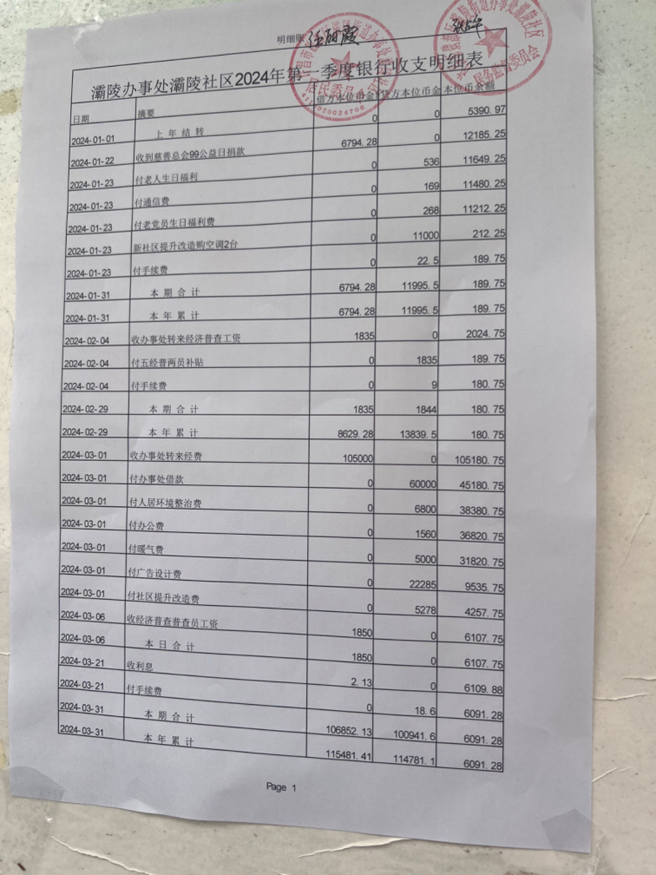 灞陵街道办事处灞陵社区2024年第一季度银行存款收支公开表