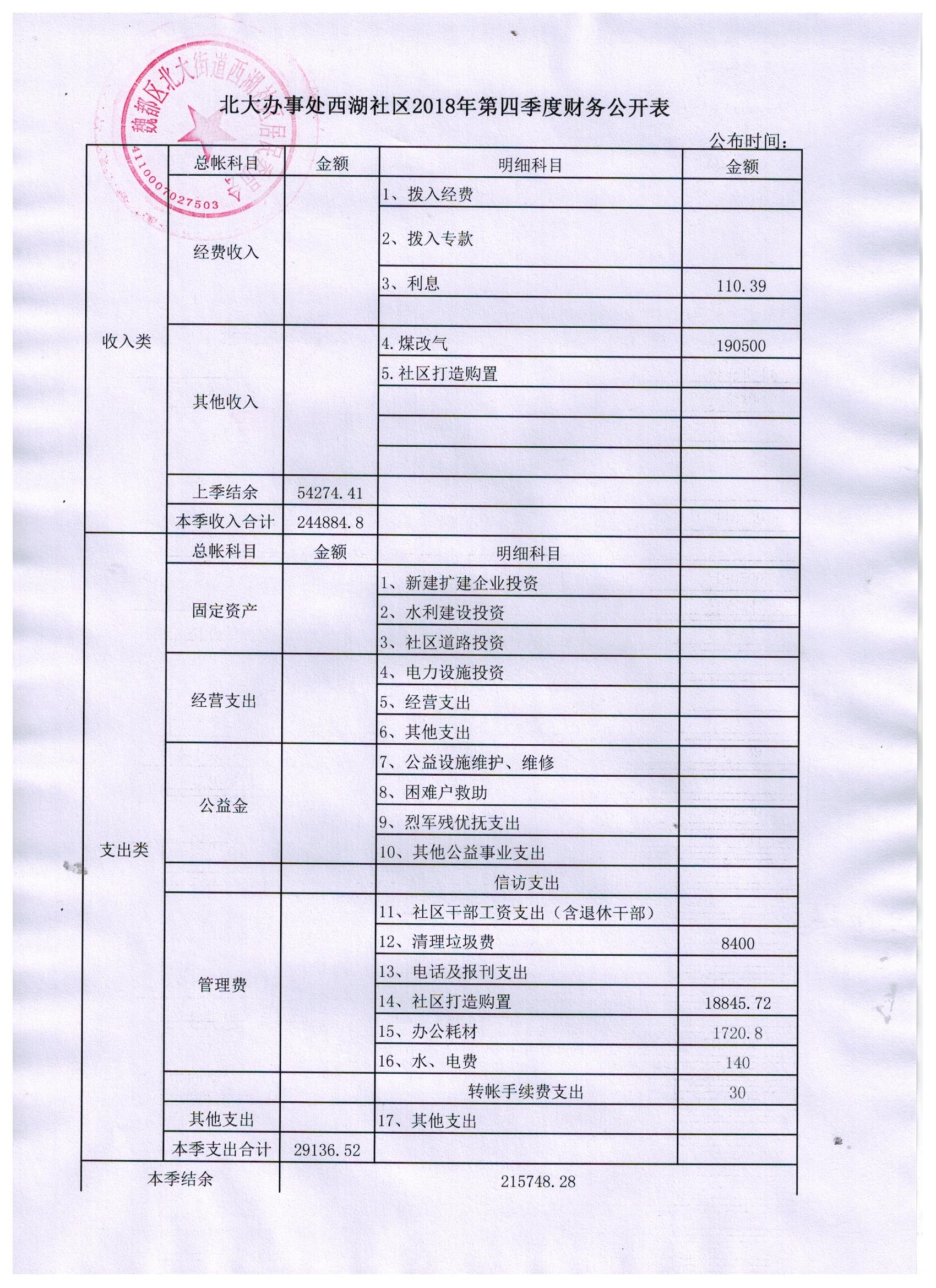 北大办事处西湖社区2018年第四季度财务公开表