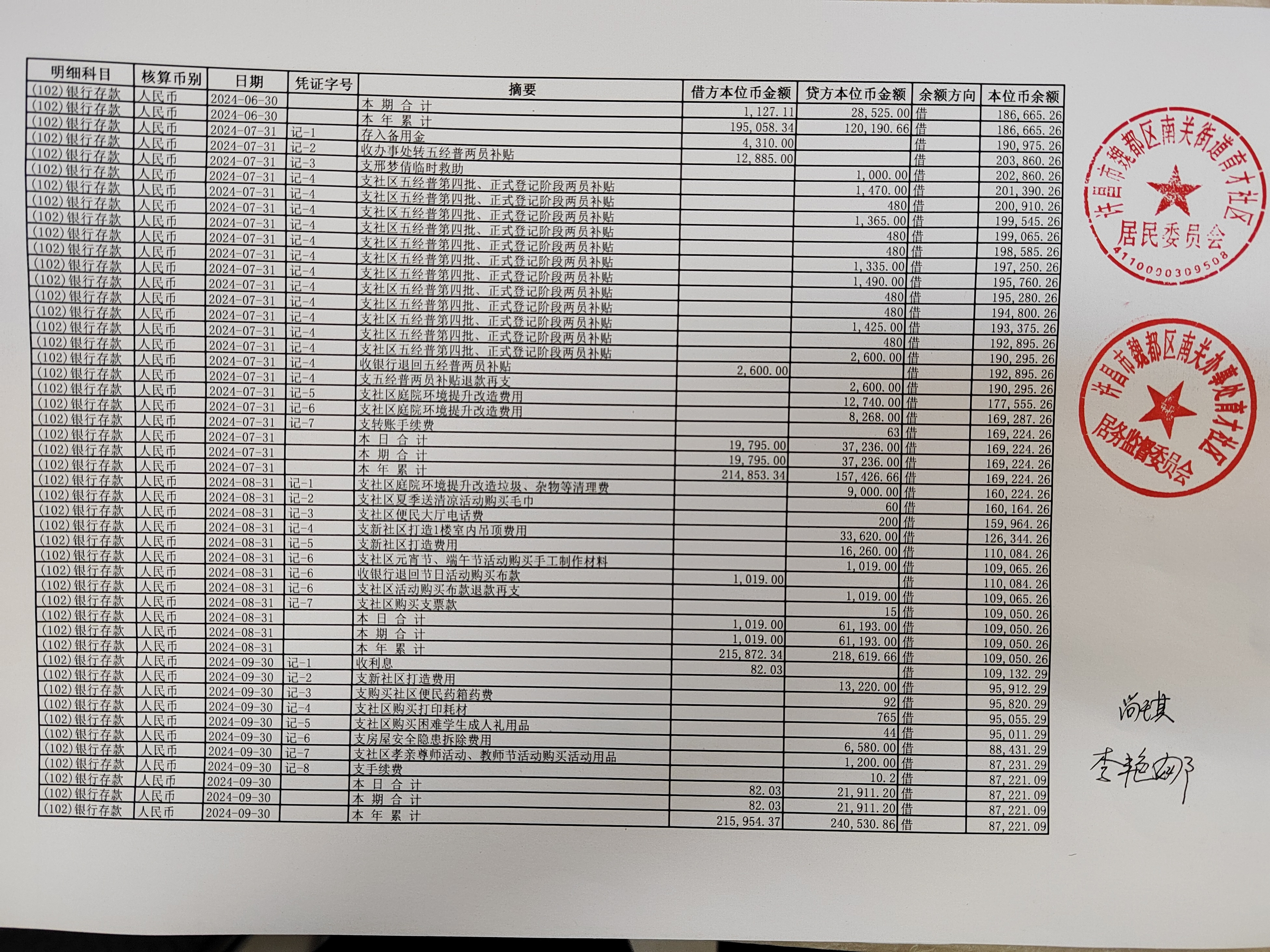南关街道办事处大同社区2024年第三季度银行存款收支公开表
