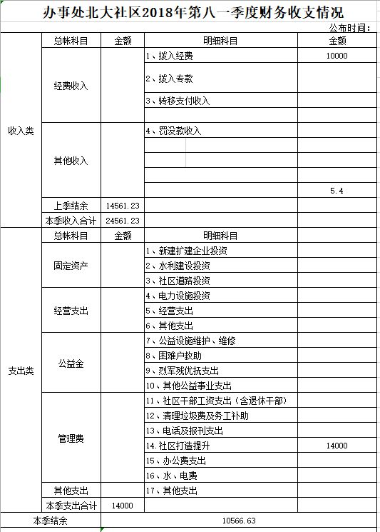 北大办事处八一社区2018年第三季度财务公开表