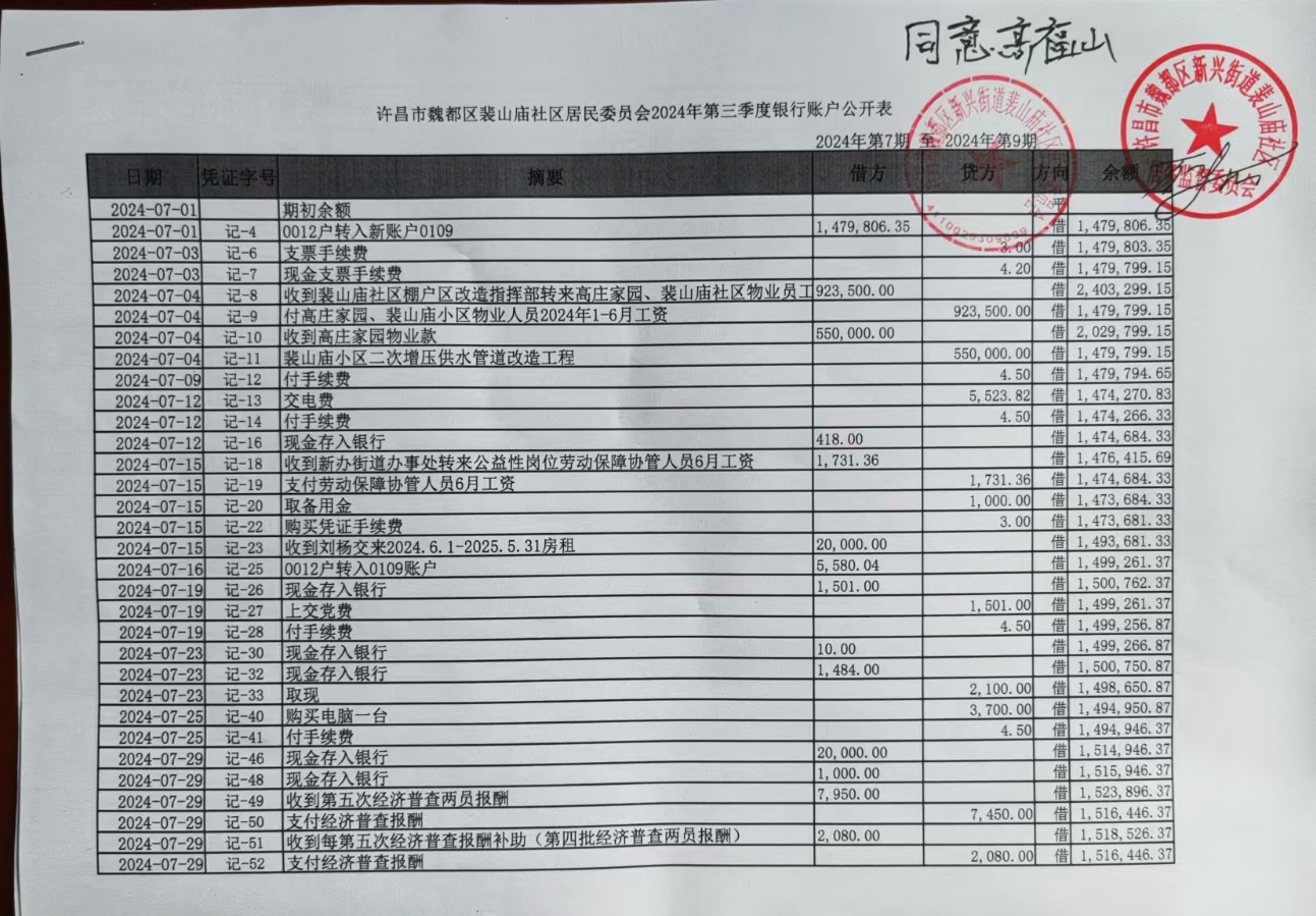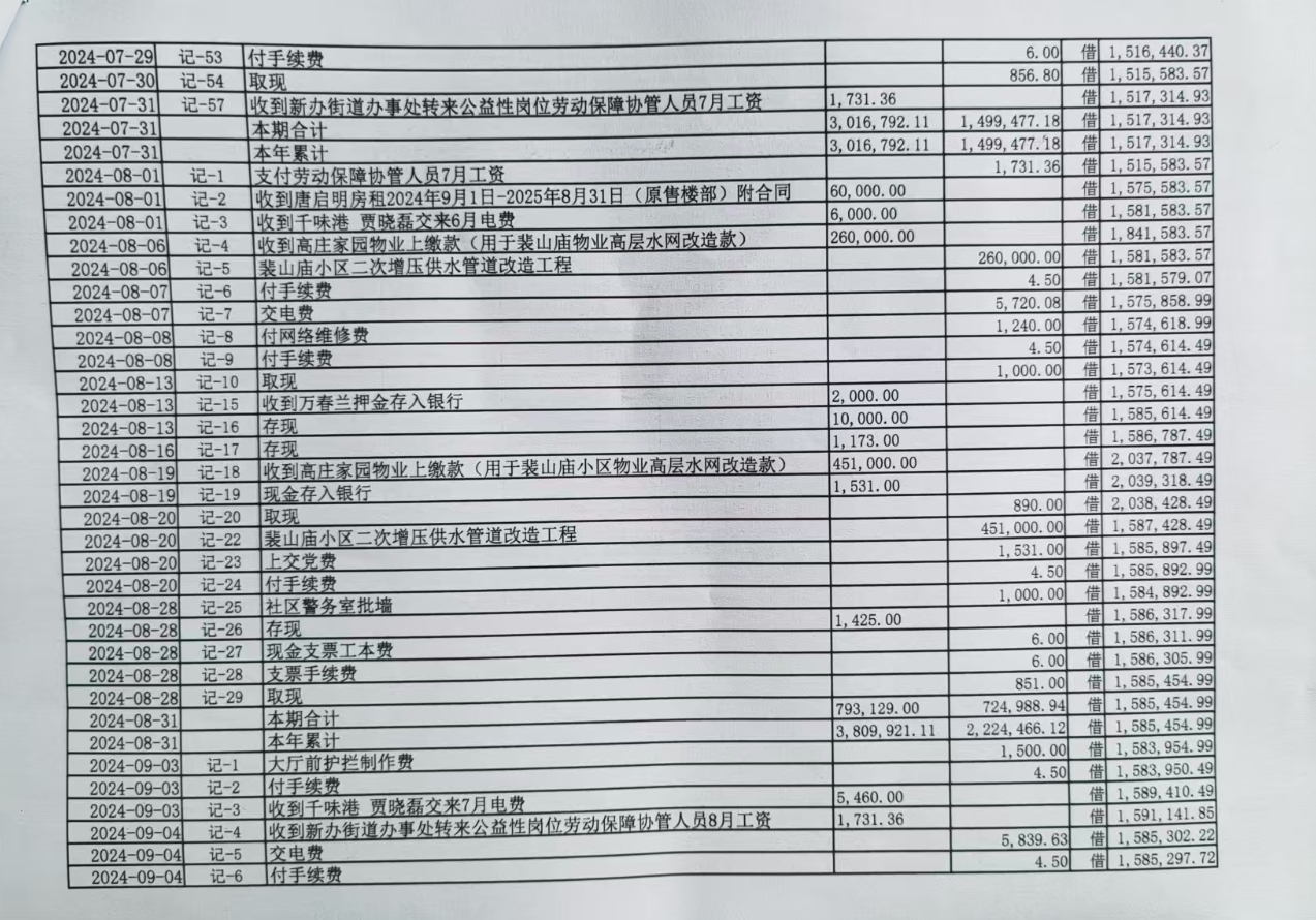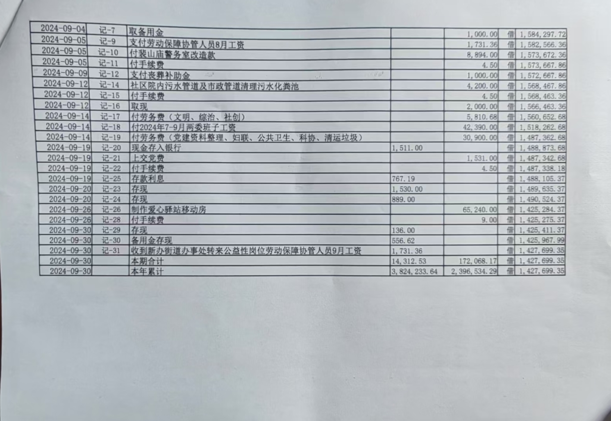 新兴办事处裴山庙社区2024年第三季度银行存款收支公开表