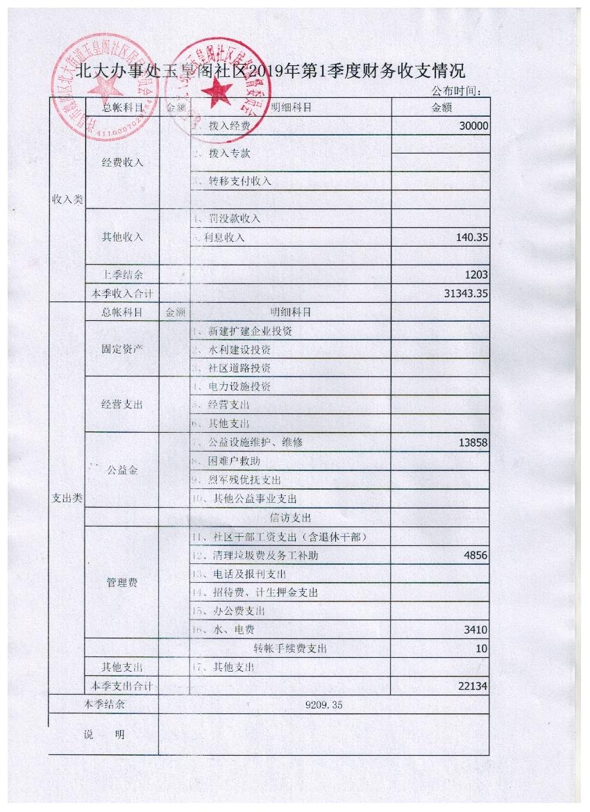 北大办事处玉皇阁社区2019年第一季度财务公开表