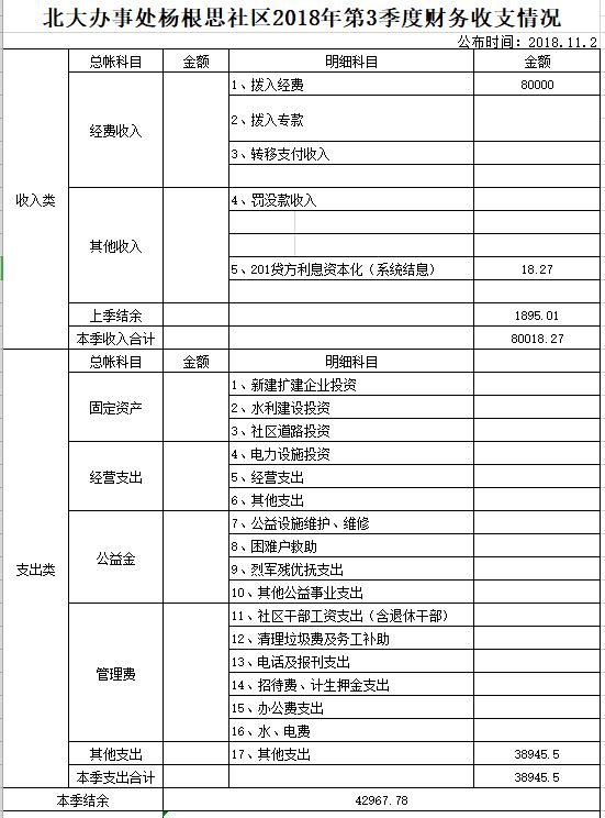 北大办事处杨根思双拥社区2018年第三季度财务公开表