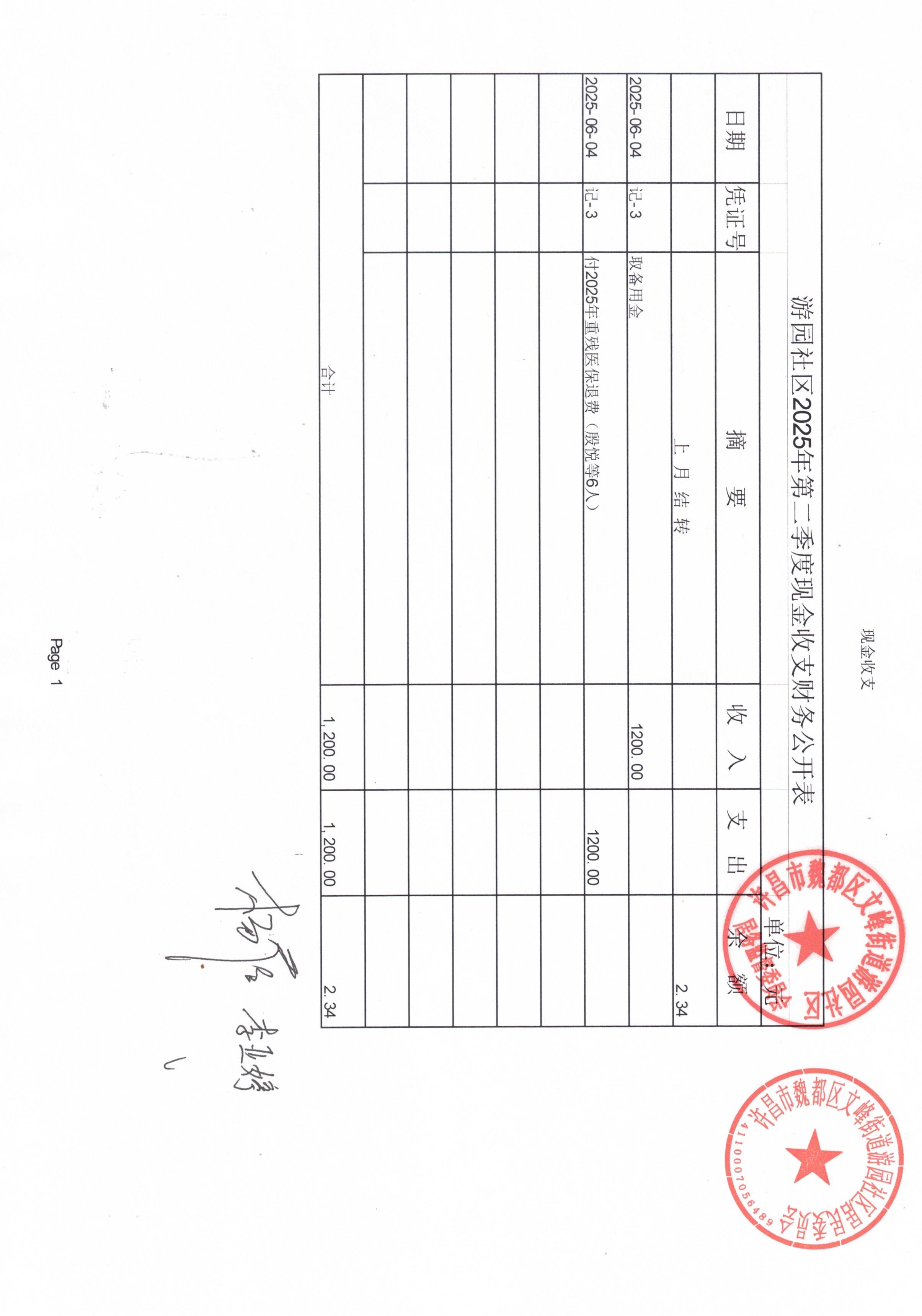 文峰办事处游园社区2025年第二季度现金、银行存款收支公开表