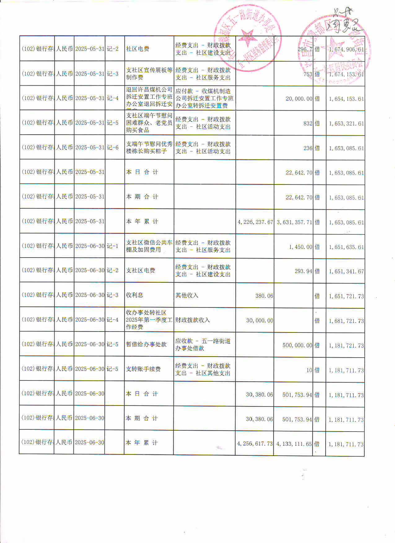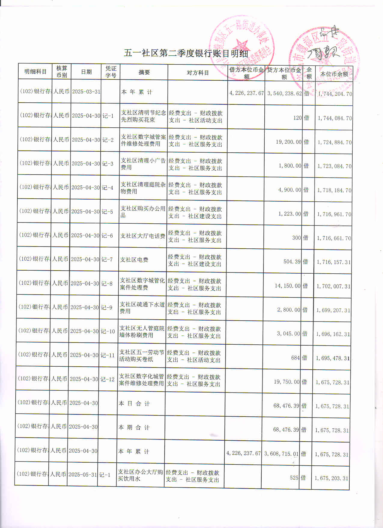 五一路办事处五一社区2025年第二季度银行存款收支公开表