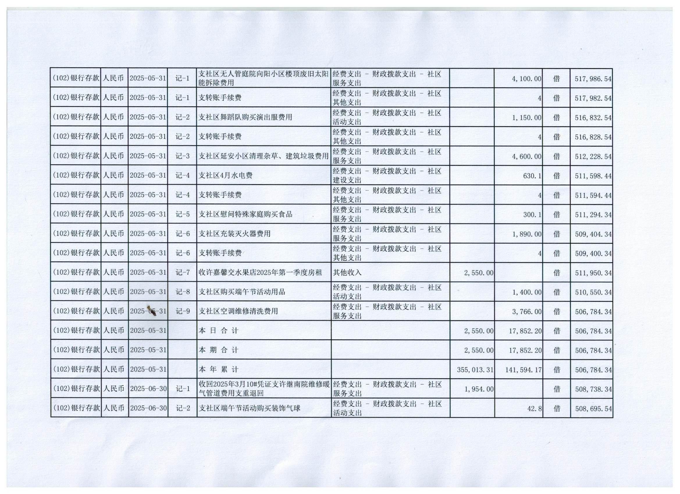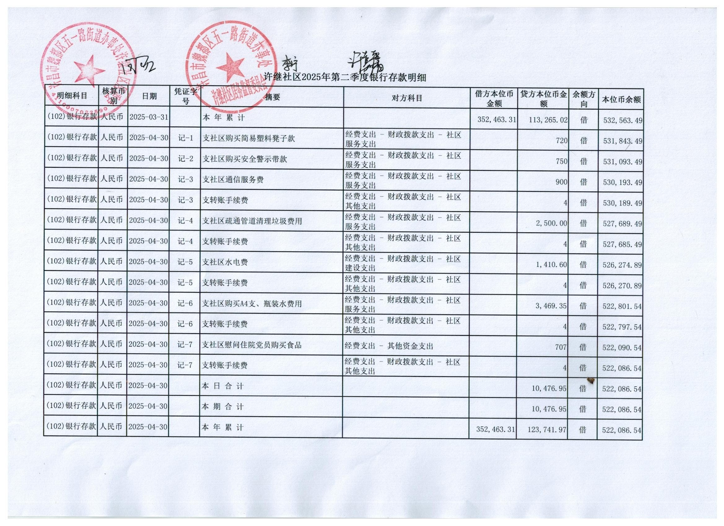 五一路办事处许继社区2025年第二季度银行存款收支公开表
